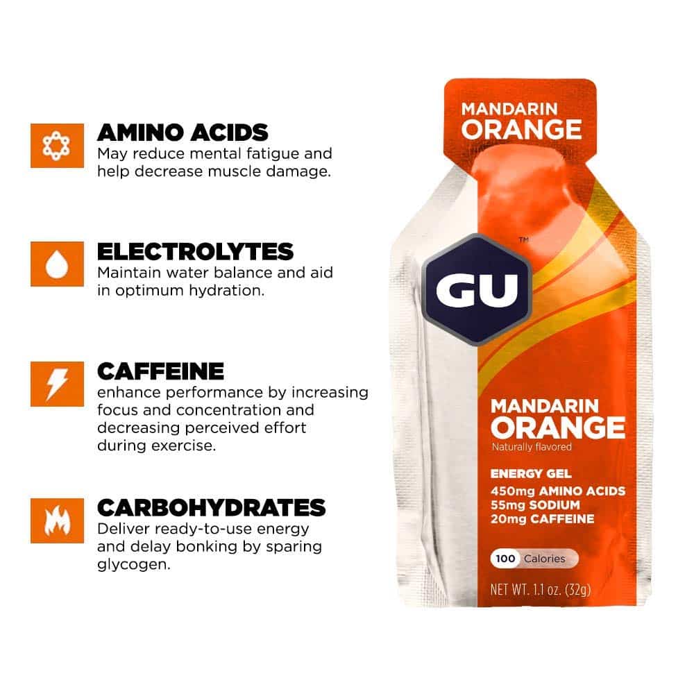 GU Original Sports Nutrition Energy Gel is the energy gel that started it all. In 1993, Dr. Bill Vaughn developed the world?s first energy gel to help his daughter perform better during ultra-marathons, and GU has been helping to propel the world?s most successful extreme athletes to success ever since. GU Energy Gel sustains all forms of athletic activity with a highly compact, portable, and calorie-dense packet that is loaded with carbohydrates that can be rapidly absorbed. Branched-chain amino acids limit muscle fiber damage and increase speed of recovery, and extra electrolytes help maintain water balance. Some flavors feature caffeine to increase concentration. While the original formula has been tweaked and evolved over the years, the end result is still the same: GU Energy Gels fuel the best endurance athletes in the world. GU Original Energy Gel comes in a wide variety of good tasting flavors. Each packet contains 450mg of Amino acids, 100 calories, and at least 21g total carbs.