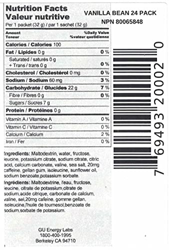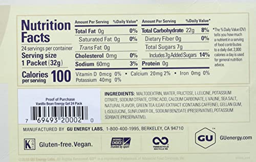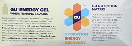 GU Original Sports Nutrition Energy Gel is the energy gel that started it all. In 1993, Dr. Bill Vaughn developed the world?s first energy gel to help his daughter perform better during ultra-marathons, and GU has been helping to propel the world?s most successful extreme athletes to success ever since. GU Energy Gel sustains all forms of athletic activity with a highly compact, portable, and calorie-dense packet that is loaded with carbohydrates that can be rapidly absorbed. Branched-chain amino acids limit muscle fiber damage and increase speed of recovery, and extra electrolytes help maintain water balance. Some flavors feature caffeine to increase concentration. While the original formula has been tweaked and evolved over the years, the end result is still the same: GU Energy Gels fuel the best endurance athletes in the world. GU Original Energy Gel comes in a wide variety of good tasting flavors. Each packet contains 450mg of Amino acids, 100 calories, and at least 21g total carbs.