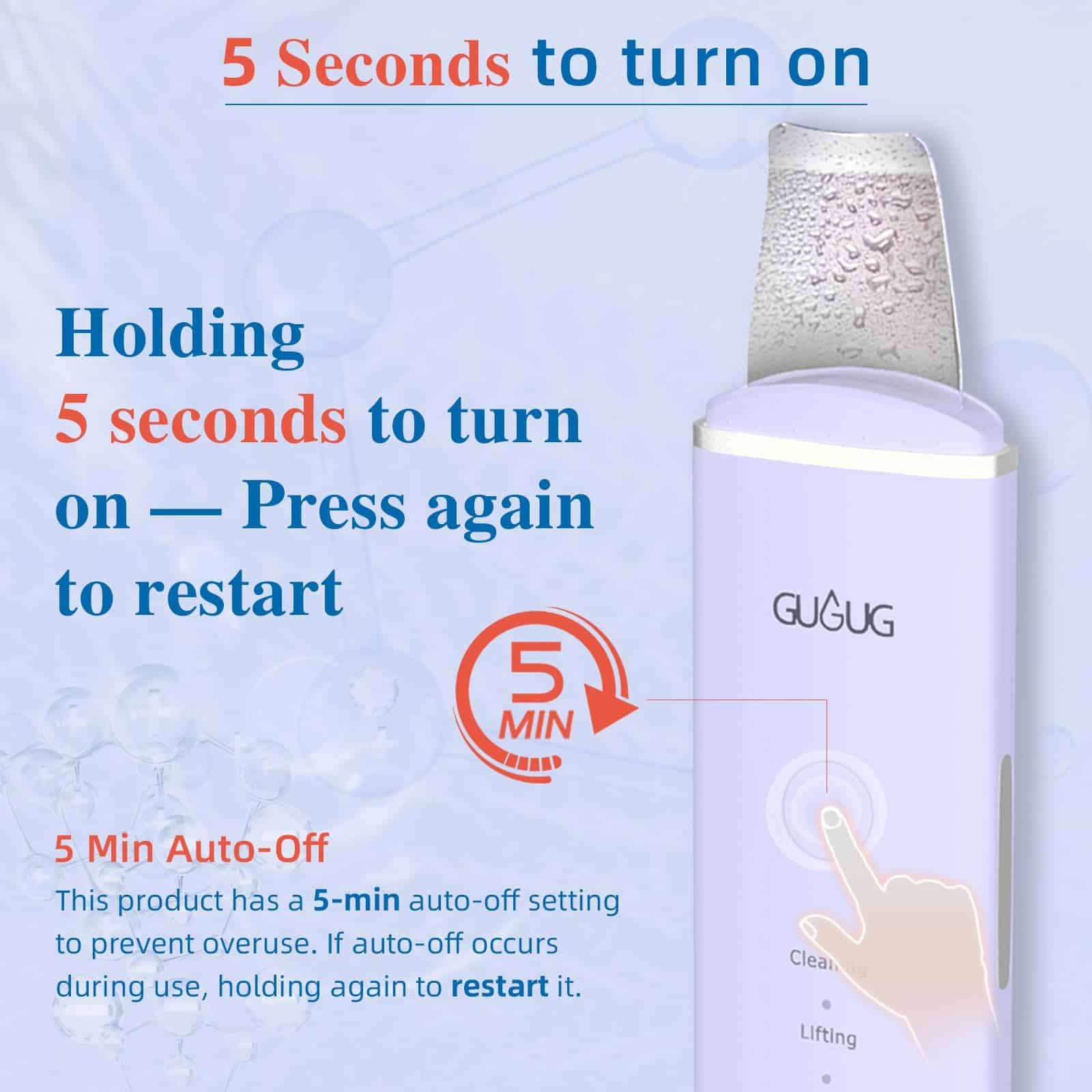 - 5 seconds to turn on: The product has an anti-touch design that needs to hold 5 seconds to turn on, and there is a 5-minute auto-off design for protecting the skin. You can restart it by holding it again.Charge the device for at least 5 hours before the first use and approximately 150 minutes after each use for ample power. Sensitive skin should reduce the frequency and time of use.