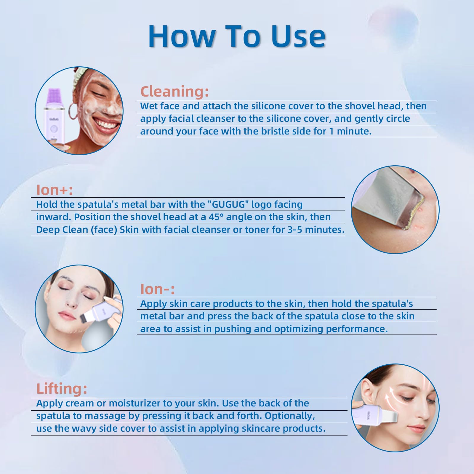- Multifunctional Skincare Tool: 4 different modes make it a multifunctional skin scrubber face spatula. Experience a complete and well-designed skin care routine starting with a deep cleansing with this skin spatula. Dampened face and glide the skin spatula blackhead remover on the face. Mini spa day with every use!