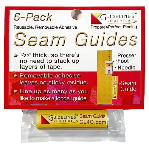 Guidelines4Quilting-Seam Guides. The perfect guide for when you use your sewing machine. Line up as many as you like to make a longer guide. Removable adhesive leaves no sticky residue. This package contains six 2×1/2 inch seam guides 1/32 Inch thick. Made in USA.