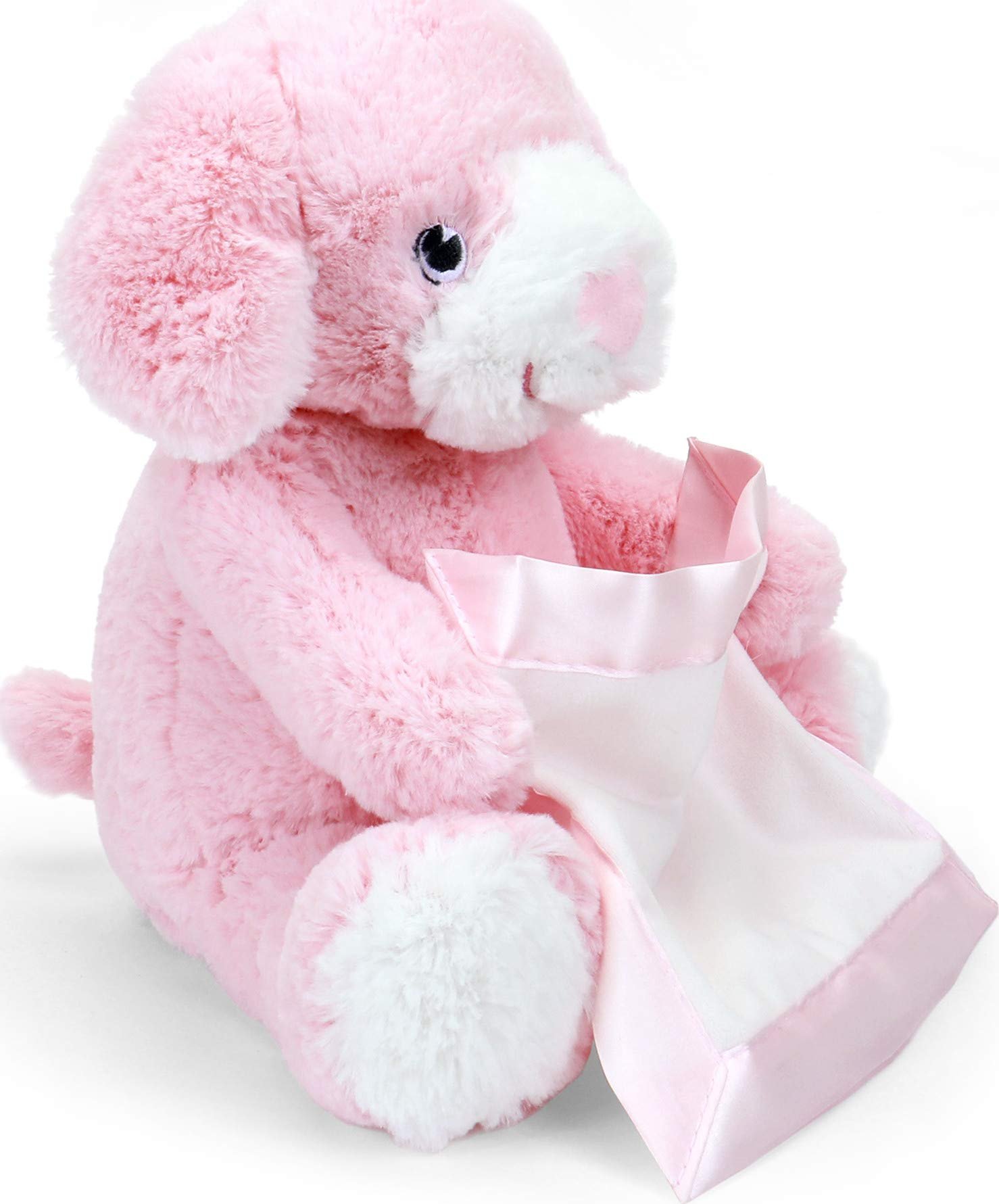 - INTERACTIVE PUPPY PLUSH BABY TOY: Playful Peek-A-Boo Puppy features safe, soft embroidered eyes and movable arms holding a matching, pink satin-accented blanket that provides additional tactile play sensation.