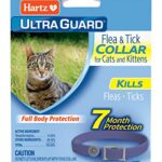 Tell pesky parasites to bug off with the Hartz UltraGuard Flea & Tick Collar for Cats and Kittens. This fresh scented, purple collar kills and repels fleas and ticks for 7 months. The water resistant design remains effective even after getting caught in the rain. Also features a breakaway safety release. For continuous flea and tick protection from head to tail, replace the collar every 7 months. Directions: Remove collar from package, unroll and stretch to activate insecticide generator. Do not use on kittens under 12 weeks of age. Do not unroll collar until ready to use. Place the collar around the cat s neck, adjust for proper fit and buckle in place. The collar must be worn loosely to allow for growth of the cat and to permit the collar to move about the neck. Generally, a properly fitted collar is one that, when fastened, will snugly slide over the cat s head. Leave 2 or 3 inches on the collar for extra adjustment and cut off and dispose of the extra length. Consult a veterinarian before using this product on debilitated, aged or medicated pets. Sensitivity may occur after using any pesticide product for pets. Some animals may become irritated by the collar if it is applied too tightly. If this occurs, loosen the collar. If irritation continues, remove the collar and bathe your cat with mild soap and rinse with large amount of water. If signs continue, consult a veterinarian immediately. Do not use this product on cats simultaneously or within 30 days before or after treatment of other flea and tick products. However, flea and tick collars may be replaced immediately.