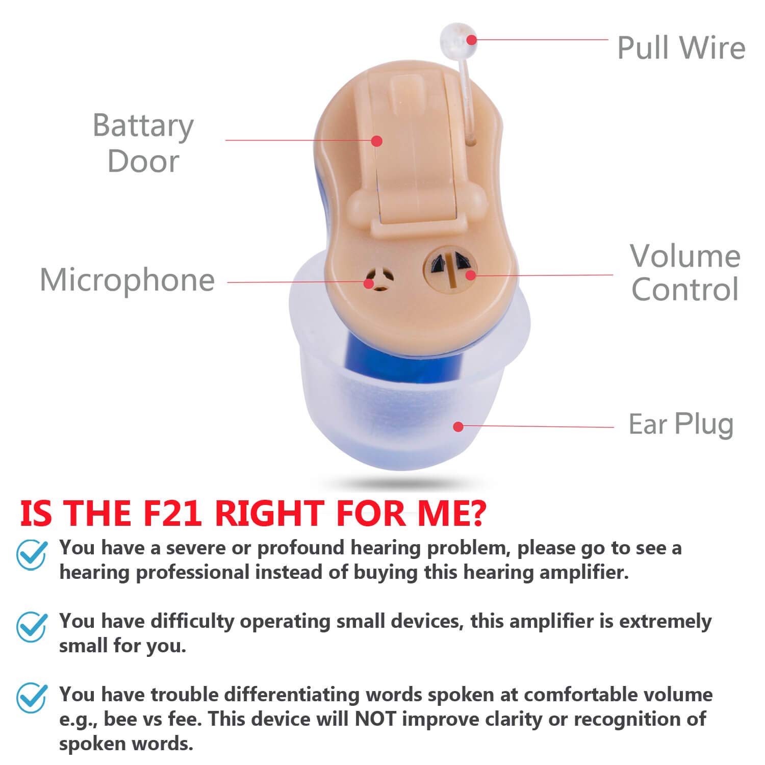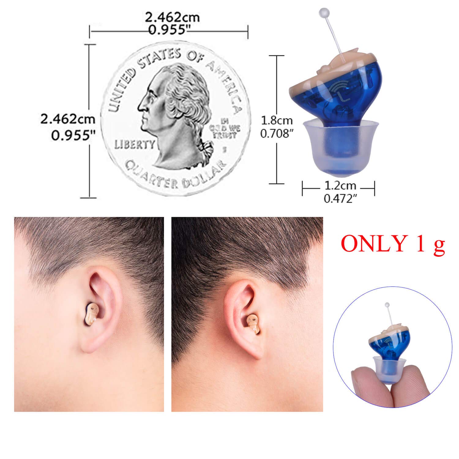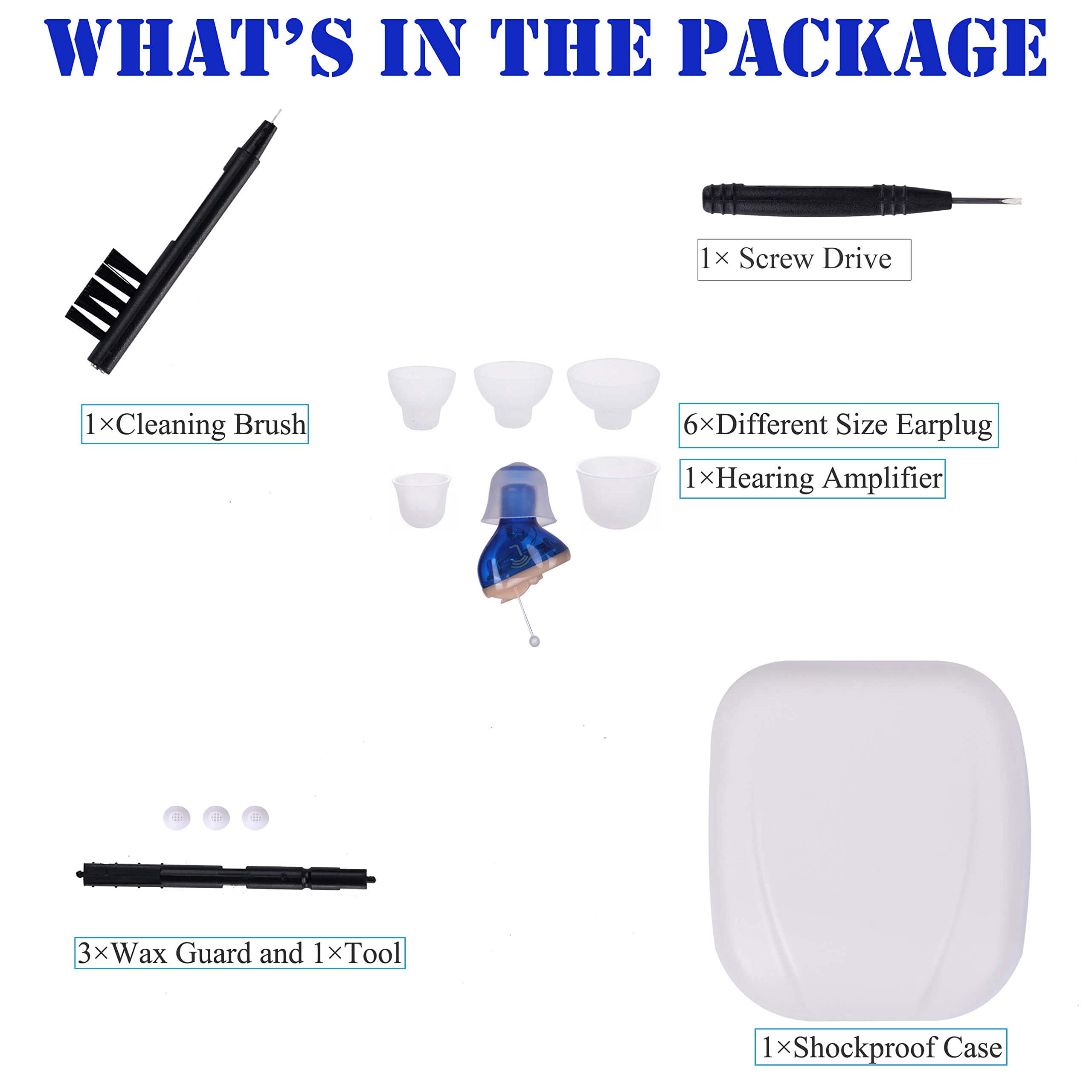 Hearing Ear Amplifiers for Seniors and AdultsMaterial:Plastics+SiliconeSize:1.8*1.2cmColor : Light Red for Right Ear ,Light Blue for Left EarQ: How to reduce feedback/whistling for this hearing amplifier?A: 1. Ensure the Ear Dome fits snugly in your ear canal, make the amplifier is occlusive in the canal, if it is too loose, replace with a larger ear dome.2. Please make sure the pulling line is below, and the volume button/dial is above when you wearing it, to wear the device properly.3. Turning down the volume prior to insert the amplifier into the canal.Q: Sound amplifier can’t work/stop working/can’t hear sound?A: 1. Change a new battery, wait for 2 minutes for full optional for a new battery.2. The ear dome or sound tube blocked by ear wax, please use the cleaning brush to clean the ear dome and sound tube.3. Please replace the wax filter if stop hearing sound.3. Change wax filter and clean/drain earplug regularly.Package( for one ear)1 x Hearing Amplifier6 x Different size Ear Domes( One dome in the Amplifier)1 x Cleaning Cleaning Tools Brush3 x Earwax Filter1 x Manuel1 x CasePackage provide Detailed wearing process, and possible problems and corresponding solutions.If you have any questions during use, please feel free to contact us, our team will provide you with professional responses within 12 hours.