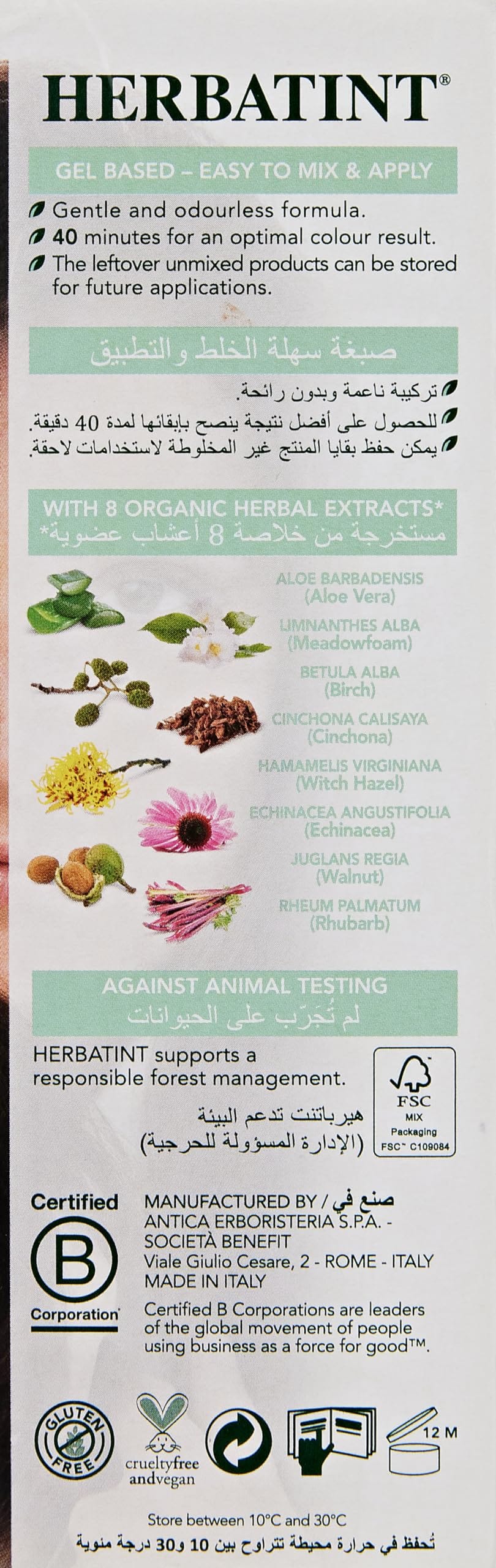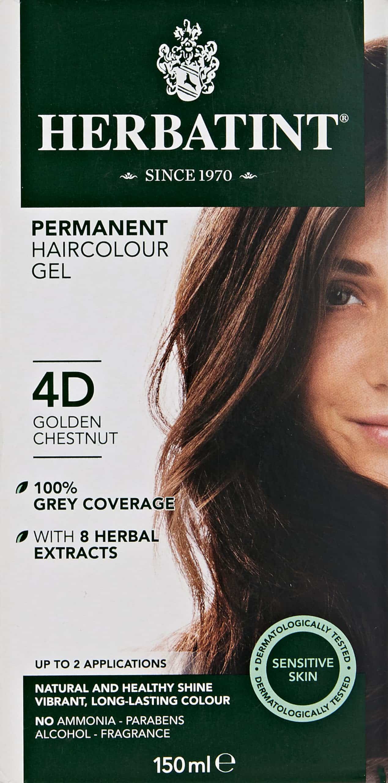 Herbatint Permanent hair color gel, 4D golden chestnut, natural and healthy shine, long lasting color. Sensitive skin. Dermatologically tested. Herbatint Permanent Haircolour Gel covers your grey effectively while taking care of your hair. Moisturizes and adds shine to the hair. Natural purifying agent and moisturizer.