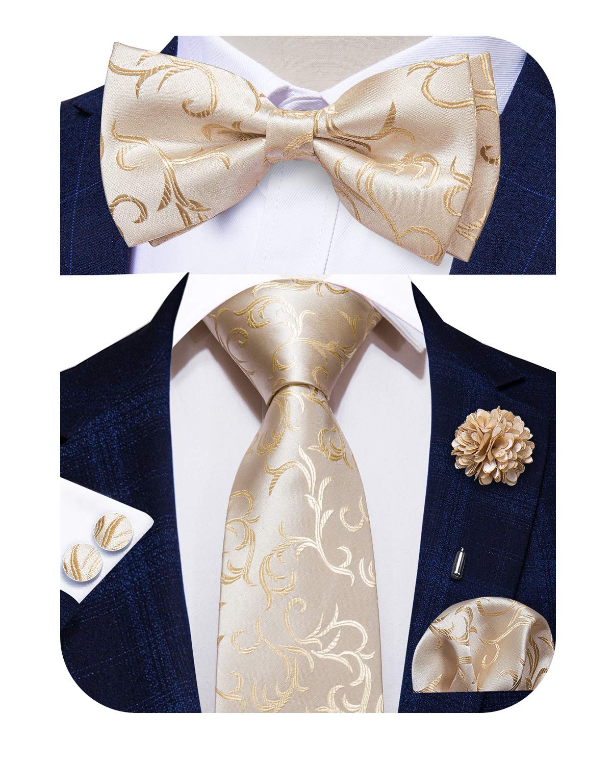 - Necktie + PRETIED Bow Tie + Pocket Square + Cufflinks + Lapel Pin
