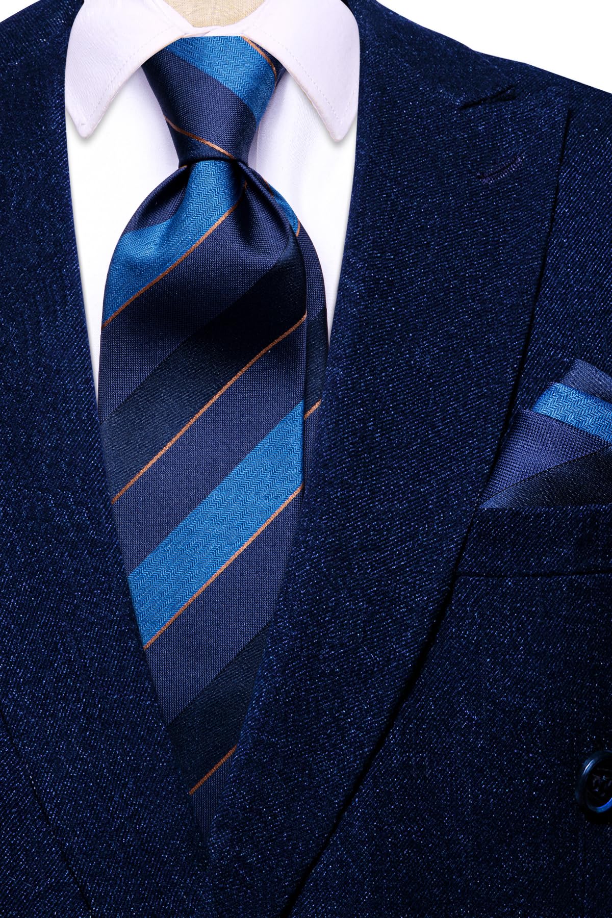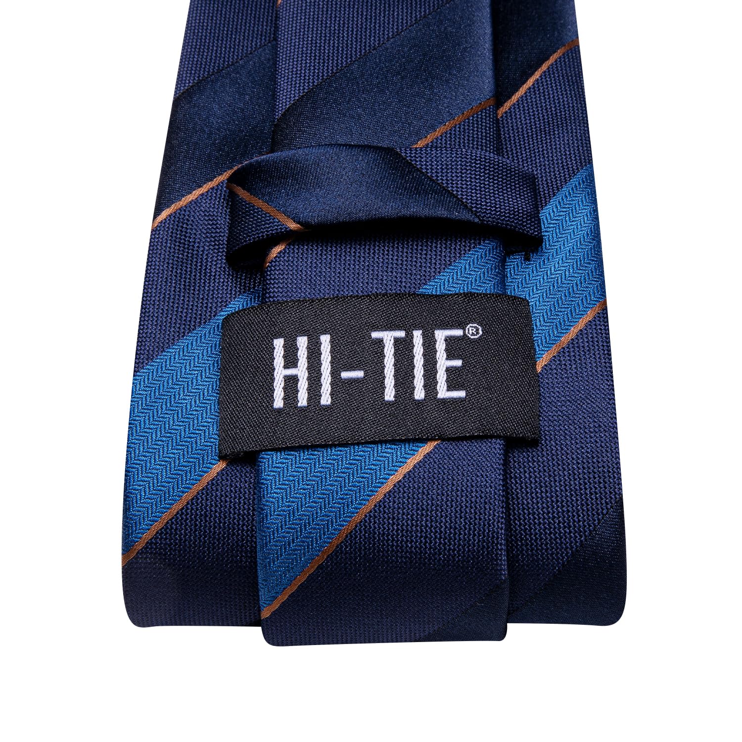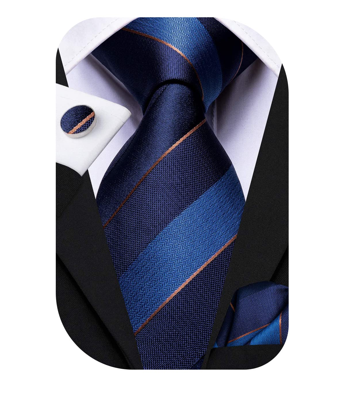 Hi-Tie Navy Blue Classic Striped Ties for Men Woven Silk Neckties with Pocket Square and C