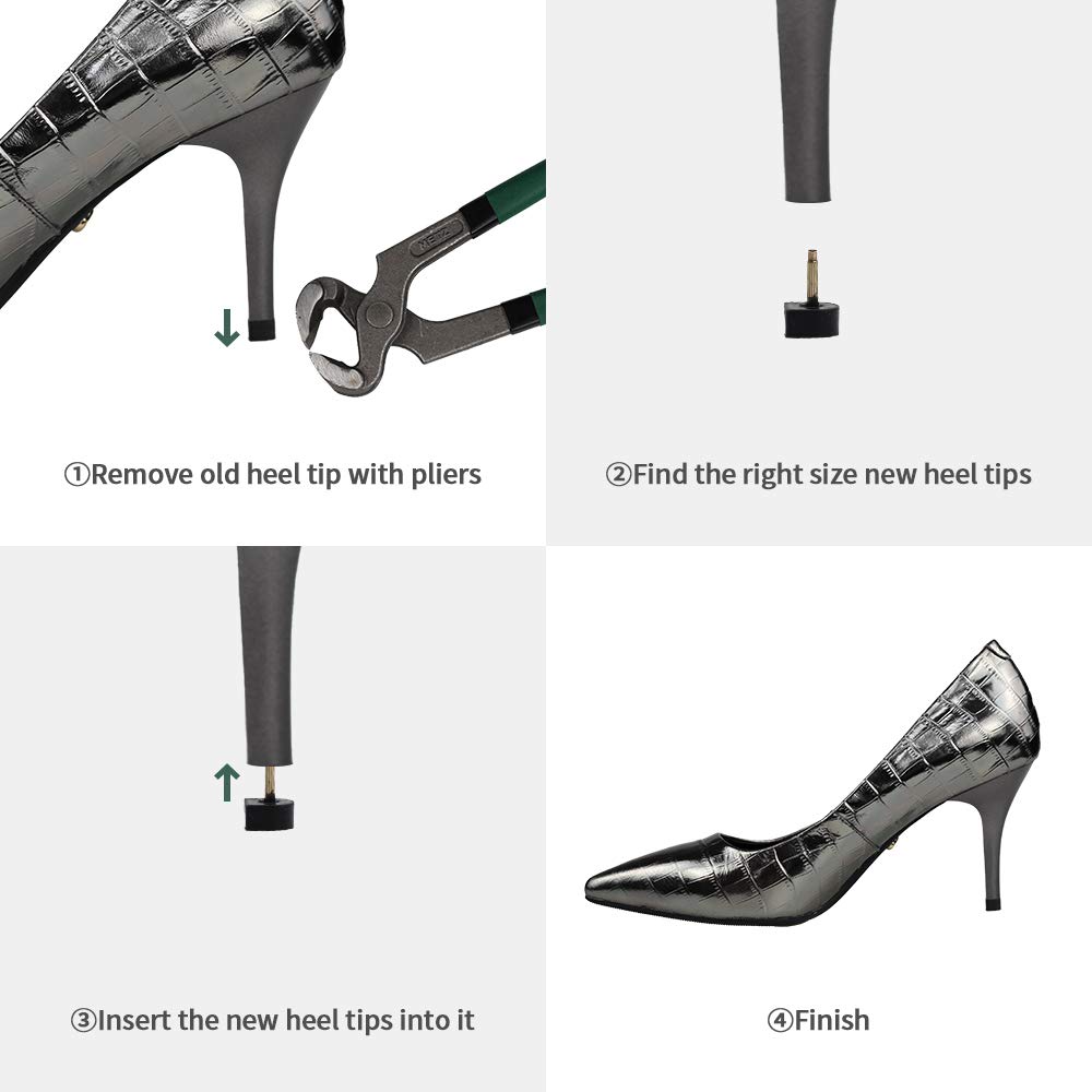 - l Usage – Easy to replacement, use specialized pliers to put out the old heel tips, then put the new one into the tips hole and tighten it, it will protect your high heel effectively.