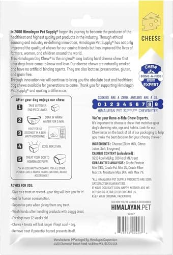 - JUST CHEESE: This is a totally natural and very nutritious dog treat made with no binding agents, preservatives or additives. We make our Himalayan yak chews from yak’s and cow’s milk with a curing process that removes lactose, allowing the yak chews to be gentle on sensitive stomachs.
