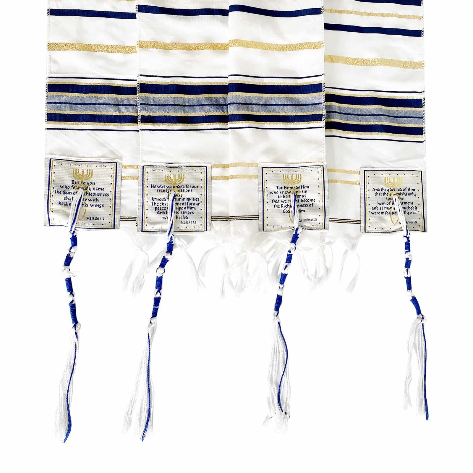 The New Covenant Prayer Shawl is designed with the main center Christian prayer in Hebrew letters & the Four prayers placed on the four corners In English. The unique early Christian sign is embroidered with golden thread. The Material Acrylic (Polyester) and the size is 72″ long and 22″ wide. Tallit comes in a bag with zipper from the same material of High Quality. all corners contain the white and blue thread A few years ago a Clay Jar was excavated in Israel which carried the early Christian seal that contained The Menorah, Star of David and the Fish is sign known as the Early Christian Sign. This Sign is placed on four corners of this shawl. This Sign contains the 7 Candle holder on Top, The Star of David in the Middle and the Fish on the bottom. The fish was used by Christians for identification during the Dark Roman Occupation in the Holy Land. The main Prayer in Hebrew on the (Atara) reads in English as follow: Blessed are you O’ Lord King of the Universe Who has fulfilled all of the law through Jesus the Messiah and have covered us with his Righteousness. Pronunciation of the above Hebrew prayer in English is: BARUCH ATAH ADONAI ELOHENU MELECH HA’ OLAM ASHER MILLA ET KOL HATORAH BIYASHU’ HAMASHIAH IKISSA ET KULANU VETSEDKATO The early Christian sign is on both sides of the main prayer made with Gold thread. The four corners are made with Blue and Gold embroidery , each corner carries a different scripts from the Bible in English and each has the Early Christian sign with Gold thread. Enlarge Pictures below to read the prayers in English that are on the 4 corners. The symbol of the Prayer Shawl Jesus had the prayer shawl on when in the Temple. Like any new clothing item, the tallit might have slight discoloring and/or smell from storage. Please wash before first use.