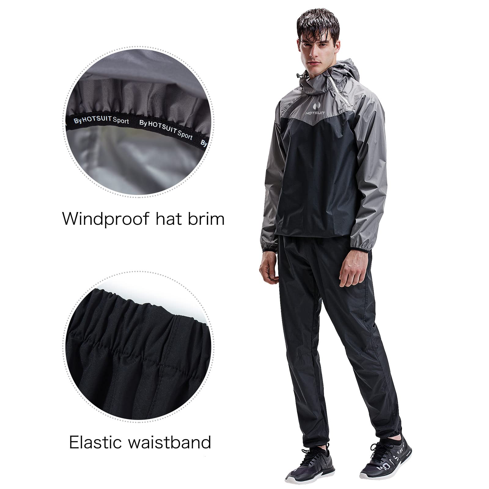 HOTSUIT Sauna Suit Men Jacket Pant Gym Workout Sweat Suits. HOTSUIT sauna suit has been scientifically proven can be widely used to body shape control and effective lose water weight. HOTSUIT sauna suit uses our own technology fabric “”nano-sliverN9000″” it’s independently research and develop. It produces and retains body heat and moisture within the garment. It sweat more when compared to similar conditions with other common sauna suit. Through the special fabric, the heat will assemble fast and cause the sweat quickly, sweat gland can perspire rapidly. It is designed to cause sweat profusely for an effective body shaping and water weight reduce. HOTSUIT sauna suit design in fashionable element, it is different from other brand’s traditional sauna suit. Waterproof zipper pockets designed on both sides of the pants. Virtual pockets on the upper clothes. The hood incorporates an elastic binding. Drawstring for the pants to best suit a wide range of body sizes. Light-reflecting LOGO placed on left side sleeve. The suit is suitable for a variety of physical activities. Including boxing, weightlifting, yoga, and fitness training. It promotes rapid perspiration, transforming excess body fat into heat. Our Sauna suit made of smooth and unique materials, more breathable, more comfortable,compare with most of other sauna suit. HOTSUIT sauna suit can increase sport efficiency and protect your skin at the same time.