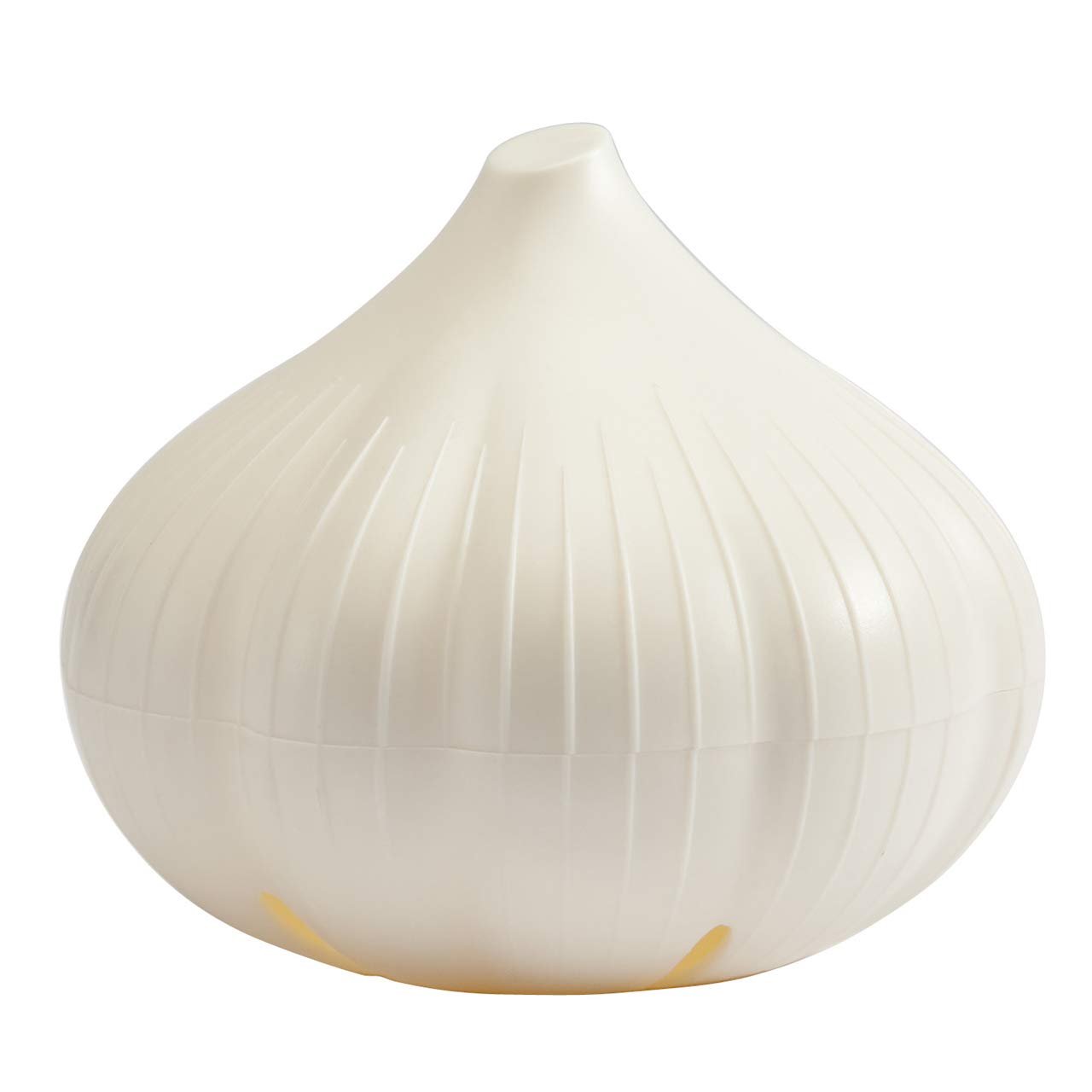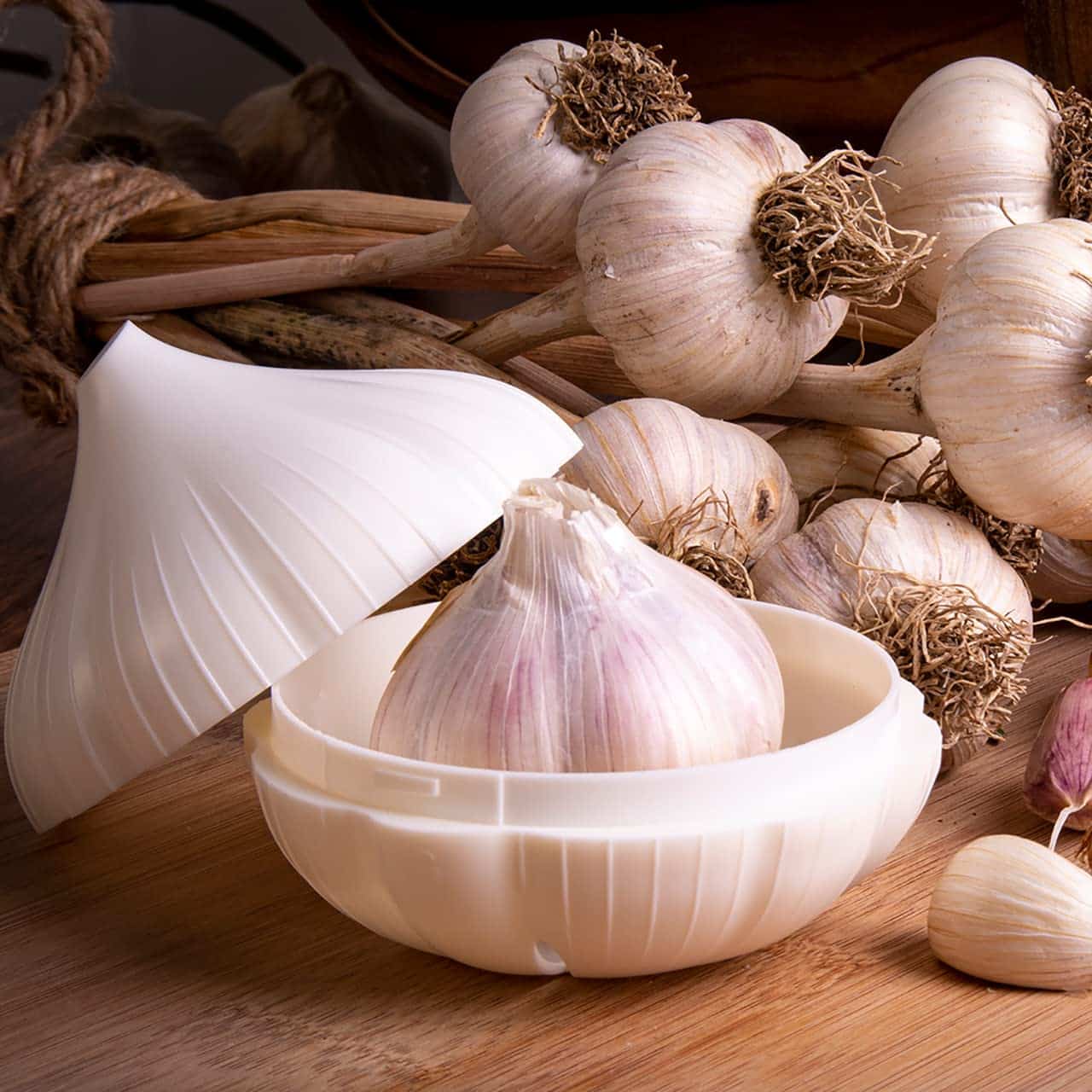 The best way to store garlic is to keep it in a well-ventilated container. This storage solution takes its cues from nature and looks just like a head of garlic.The holes allow for air circulation around the garlic. It will keep your garlic fresher longer, usually an additional 30 -45 days! The 2 sides of the Garlic Saver attach by twist lock. Dishwasher safe for easy cleanup. BPA free. Stores 1 head of garlic. Diameter: 3.9? Height: 3.4″