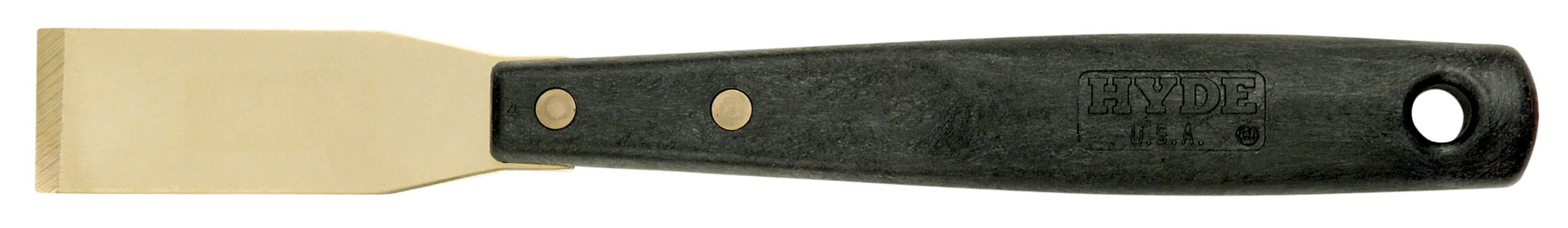 Brass non-spark blade for scraping delicate surfaces or working in volatile environments. Polypropylene handle with large hang hole for storage. Measures 11-1/4? overall; 1-5/16? blade.