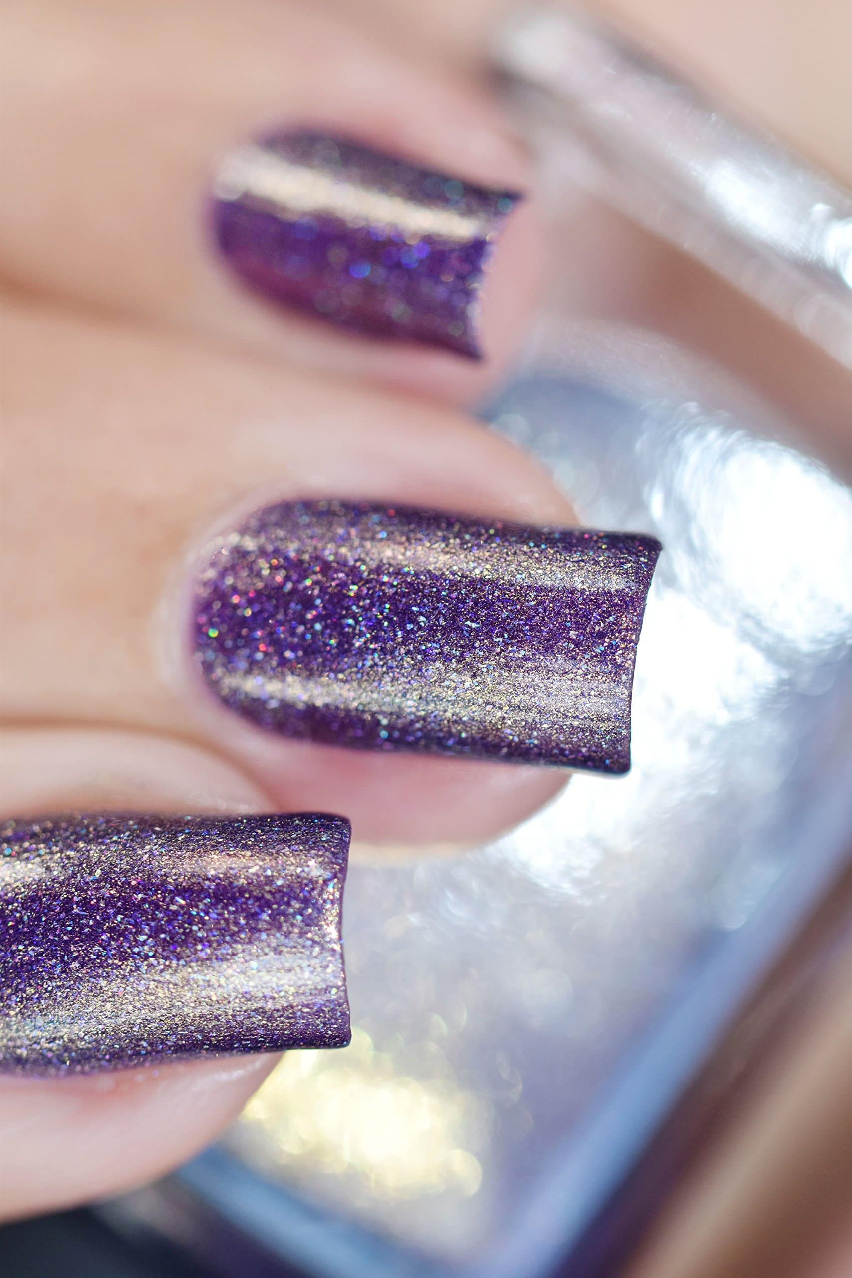 - REGAL PURPLE HOLOGRAPHIC NAIL POLISH – Jam-packed with a beaming yellow-gold to silvery green sparkle as well as an assortment of holographic micro-flakes