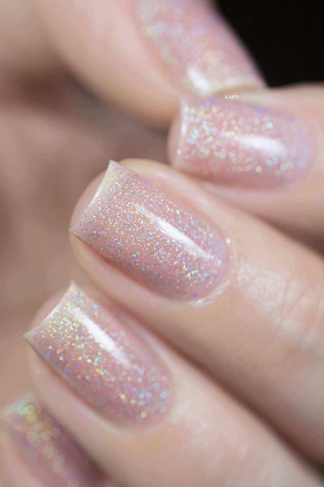 Sandy Baby is a subtle and sophisticated peach beige jelly that is extremely versatile, super holographic and builds beautifully! A serious sheer knockout that can be worn over a base, by itself, sandwiched, or built up heavily for a jaw dropping manicure with incredible depth and a mind blowingly vivid holographic sparkle! Easily built up or sandwiched, the sheer formula of our jellies make way for our scattered holographic micro-flakes to work their magic all the way through each layer right down to your nails! The end result is a super crisp and sparkly finish with unmistakable depth. Fully opaque in 3 to 4 coats!