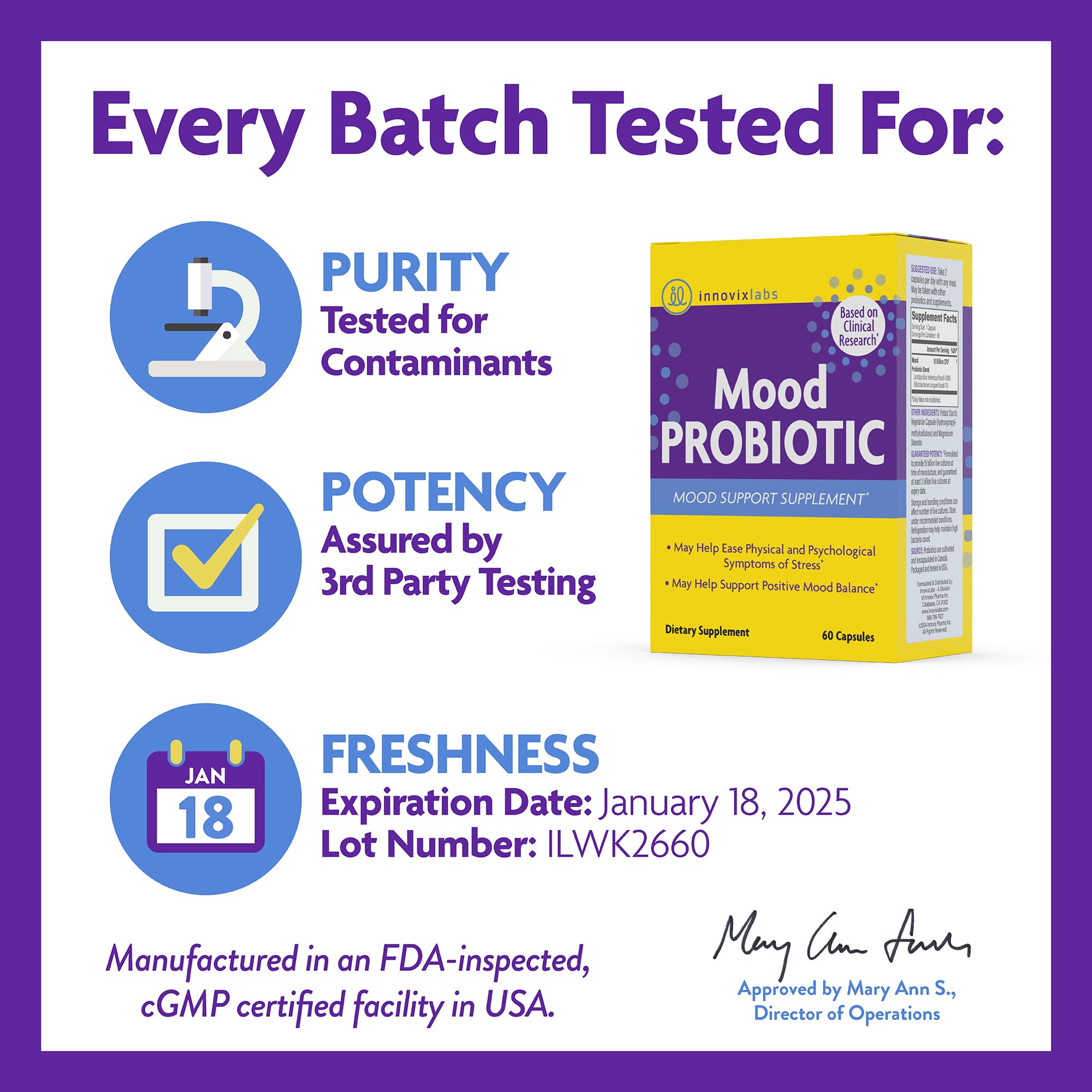 - Third-Party Tested, InnovixLabs probiotic mood support supplement is cultivated and encapsulated in Canada, tested and packaged in the USA, plus all of the probiotic nutritional supplements undergo third-party testing for purity, potency, and quality