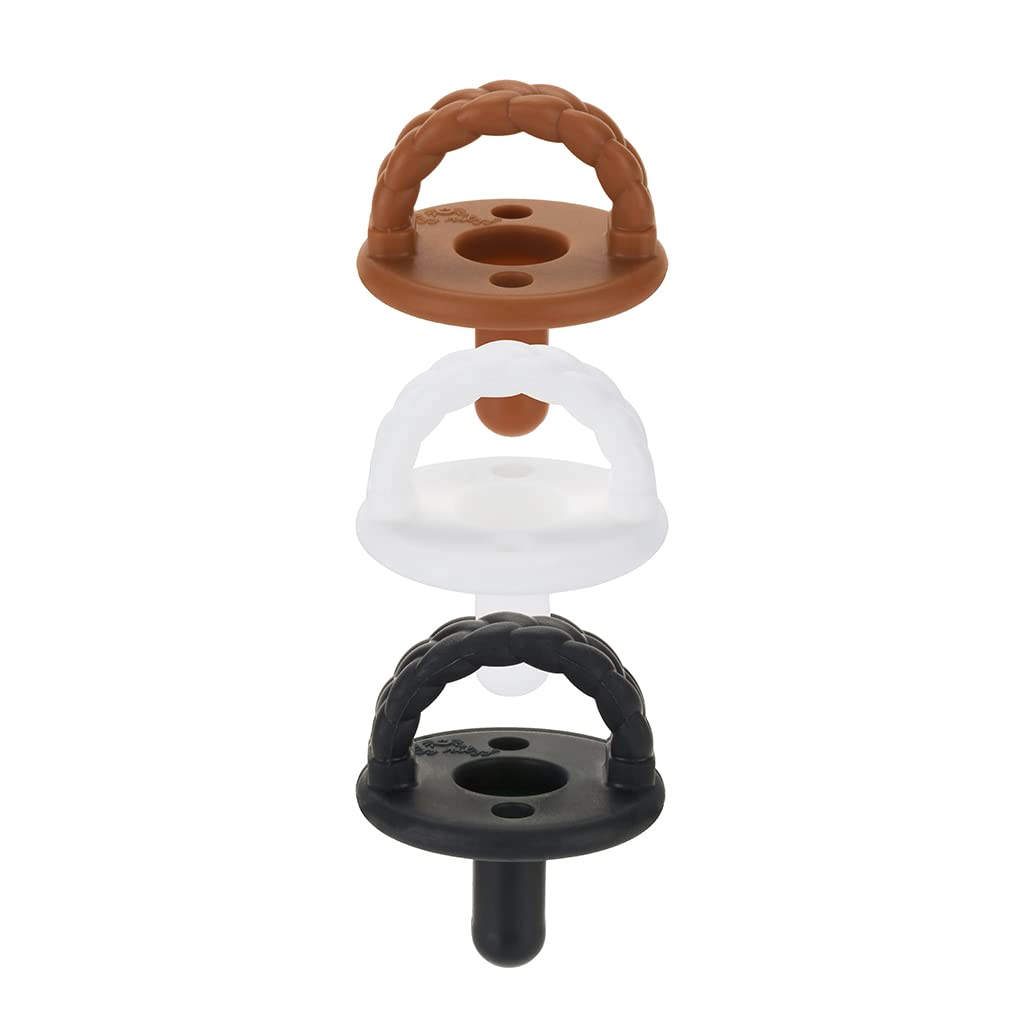 - SET OF THREE: The pacifiers in this coordinating set of two each feature a unique braid detail on the collapsible handle, making your little sweetie look even cuter!