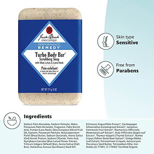 All Jack Black products are carefully formulated with the finest ingredients to be highly effective, yet easy to use. Every Jack Black product is dermatologist tested, paraben free, cruelty free, and free of harsh surfactants. Almost all of the products in our line are vegan, free of artificial colorants, safe for sensitive skin, and made in the USA. For best results, use Jack Black Turbo Body Bar Scrubbing Soap morning and night to cleanse skin. Run bar under water, working into a thick, rich lather. Gently rub in a circular motion over the entire body.