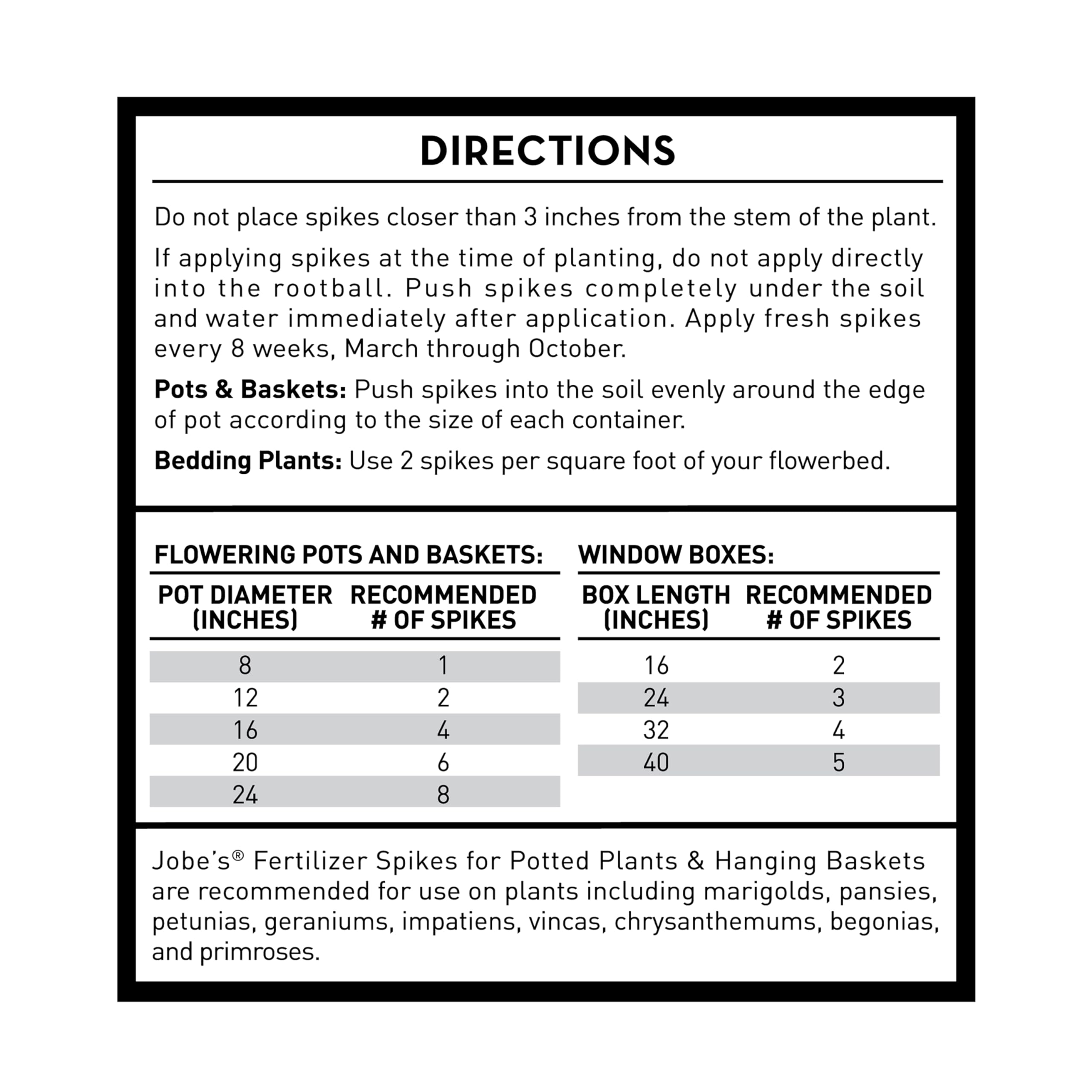 - Jobe’s fertilizer spikes come pre-measured to provide the right amount of nutrients for your plants and flowers with no risk of over fertilizing