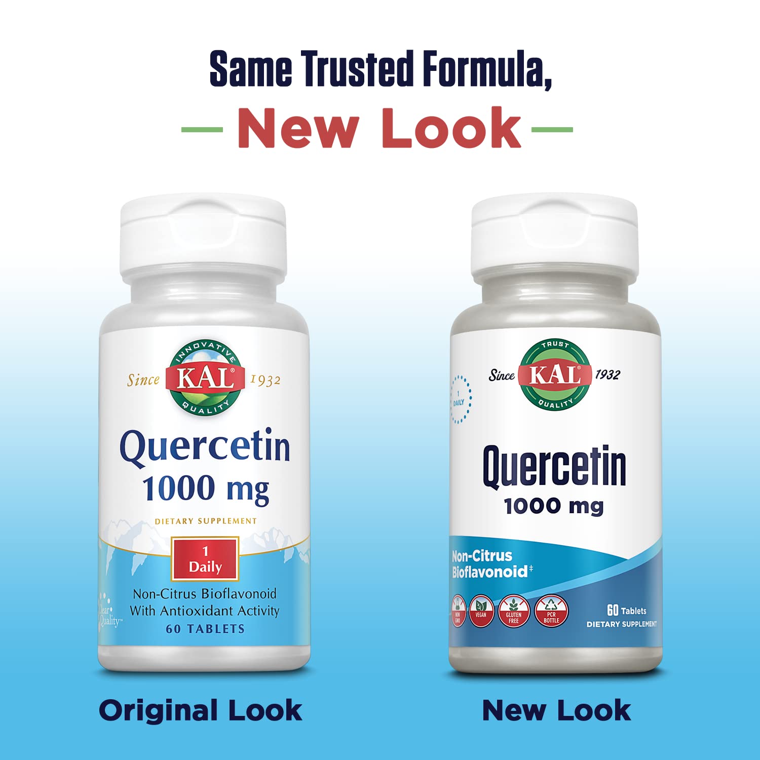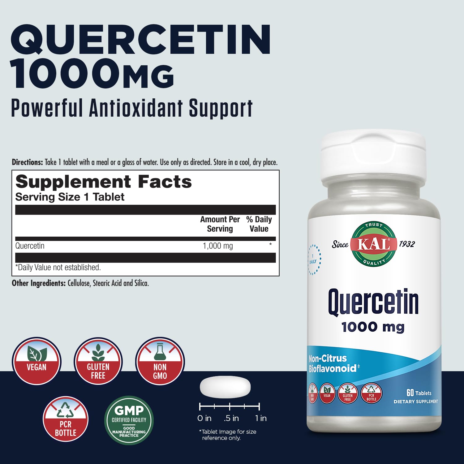 - KAL Quality ? Vegan, gluten free and non-GMO, our Quercetin is lab tested for potency and purity and made in our GMP-certified facility in Utah to bring you the best possible quality. Plus like all KAL products, it comes with a 60-day money back guarantee.