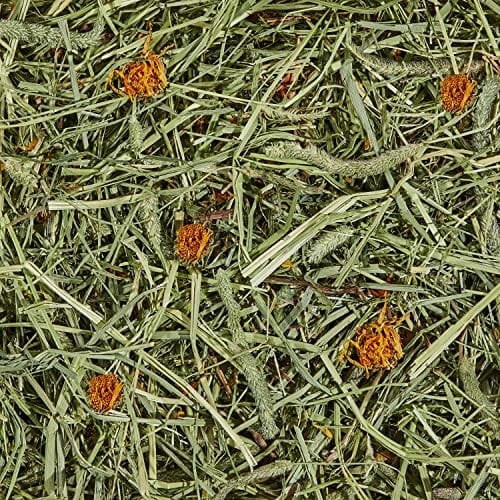 - Long strand timothy hay plus marigold to provide a variety of textures and flavors for added enrichment