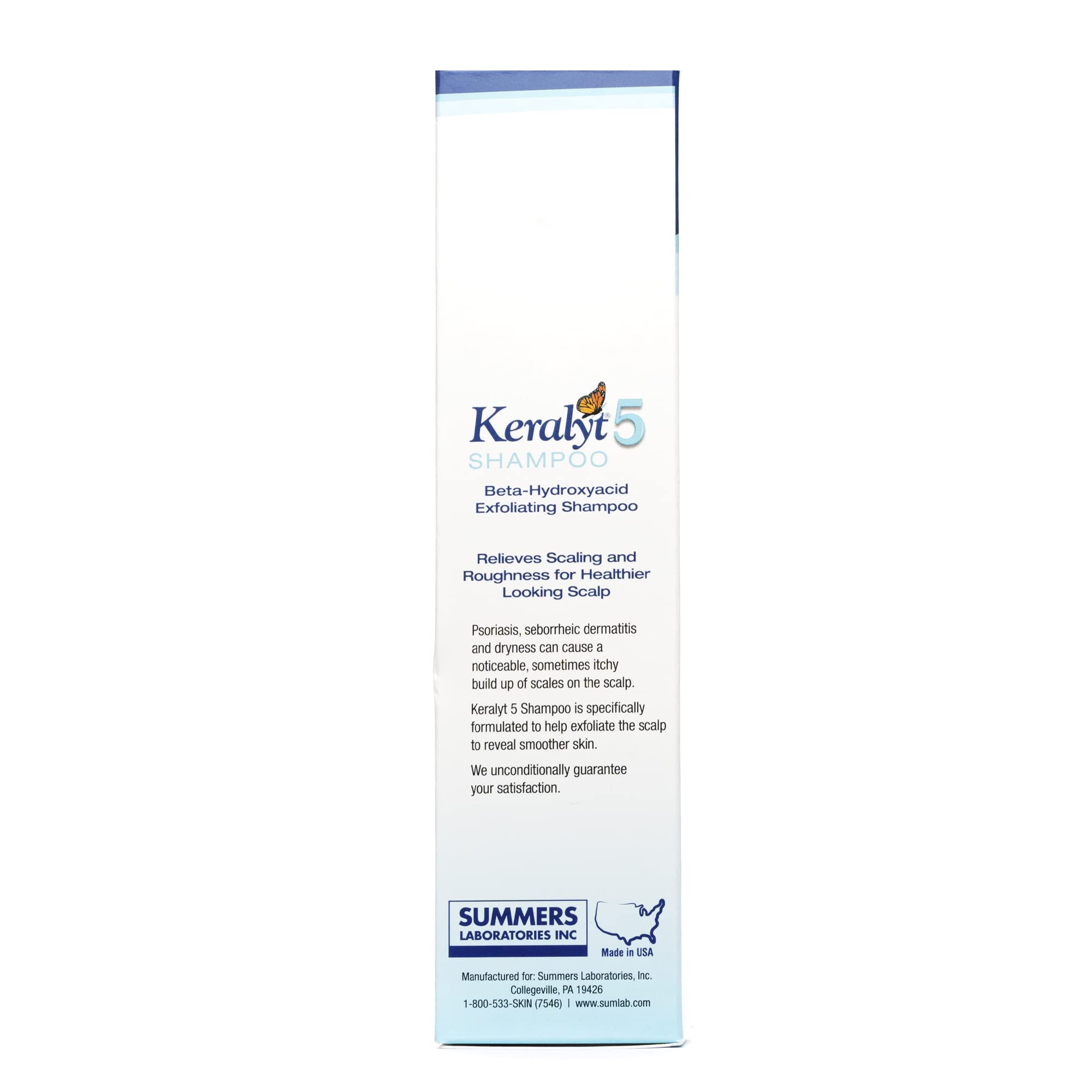 Keralyt 5: Beta Hydroxyacid Exfoliating Shampoo (177 ml Bottle)Get the confidence and support you need to make sure your scalp stays smooth, clean, and free of flaky residue with Keralyt 5 Anti-Dandruff Shampoo. These are serious maximum strength 5% salicylic acid shampoos, made to help relieve the worst scalp skin problems from some of the toughest skin conditions. Keep your skin looking its best and feeling its best with Keralyt 5!Exfoliating ActionKeralyt 5 starts working immediately to exfoliate away unsightly skin redness, roughness, flaky areas, dryness, and itchy spots. Our unique compound is made to fight dandruff and scalp problems from a wide range of conditions like psoriasis, seborrheic dermatitis, and more. The applicator tip allows you to use this as a dry treatment before bathing or regularly as a shampoo. To use dry apply to the scalp before bathing and let sit. You’ll want to let it set for as little as 5 minutes at the start but can work up to longer intervals of up to 1 hour. To use as a shampoo massage vigorously into wet hair for several minutes and rinse thoroughly. After use you can another non-medicated shampoo if desired.Try the full Keralyt 5 suite for comprehensive full-body relief. The Keralyt 5 skin cream is great for most areas of the body, our 3% gel is great for concentrating on more sensitive areas of the skin, and our scalp shampoo and gel help address problems around your scalp and hairline. No matter what the issue is, we have the solution.Designed for Real SupportKeralyt 5 is made by Summers Laboratories. It’s our goal to make simpler to use solutions that focus on more than short-term relief. We make products that give you the immediate relief you need but also support for long-term healing wellness. We create unique products to address a wide range of skin problems. It’s our goal to create more than lotions, creams, ointments, and gels. We create peace of mind.