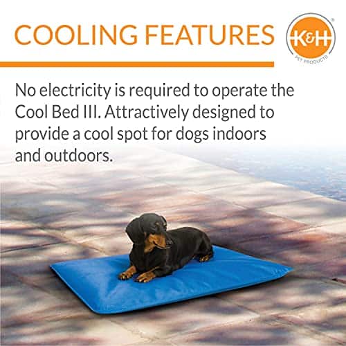 Keep pets cooler than ever! No electricity required to operate the Cool Bed III. Simply add water through the easy fill cap and adjust the comfort with the easy air valve. Our unique cool core diverts liquid better than ever throughout the bed for advanced cooling power. Tough nylon/vinyl exterior. The Cool Bed III is the affordable choice for any dog owner looking to offer their pet a comfy, dry, cool place to relax. This cooling dog bed is recommended for indoor and outdoor use to help keep dogs cool in the summer months. Recommended for use in temperatures under 100?F. Place in a shaded area for best performance. Two-year limited warranty.
