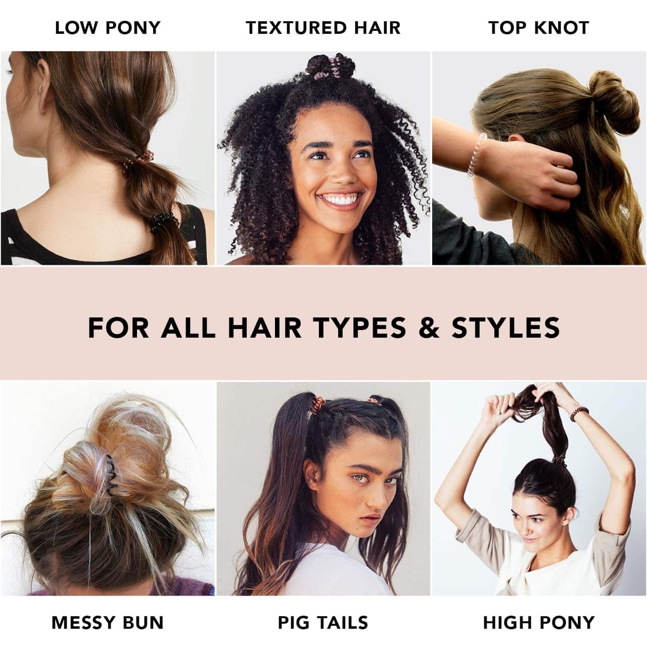 • THE BEST SPIRAL HAIR TIE FOR YOU: The 8-pack brunette is the ideal set of spiral ponytail holders for thick hair of any color! Our plastic hair ties for curly hair are gentle on your hair. The smooth plastic and spiral design of these curly hair ties prevents tangling and hair breakage upon removal.