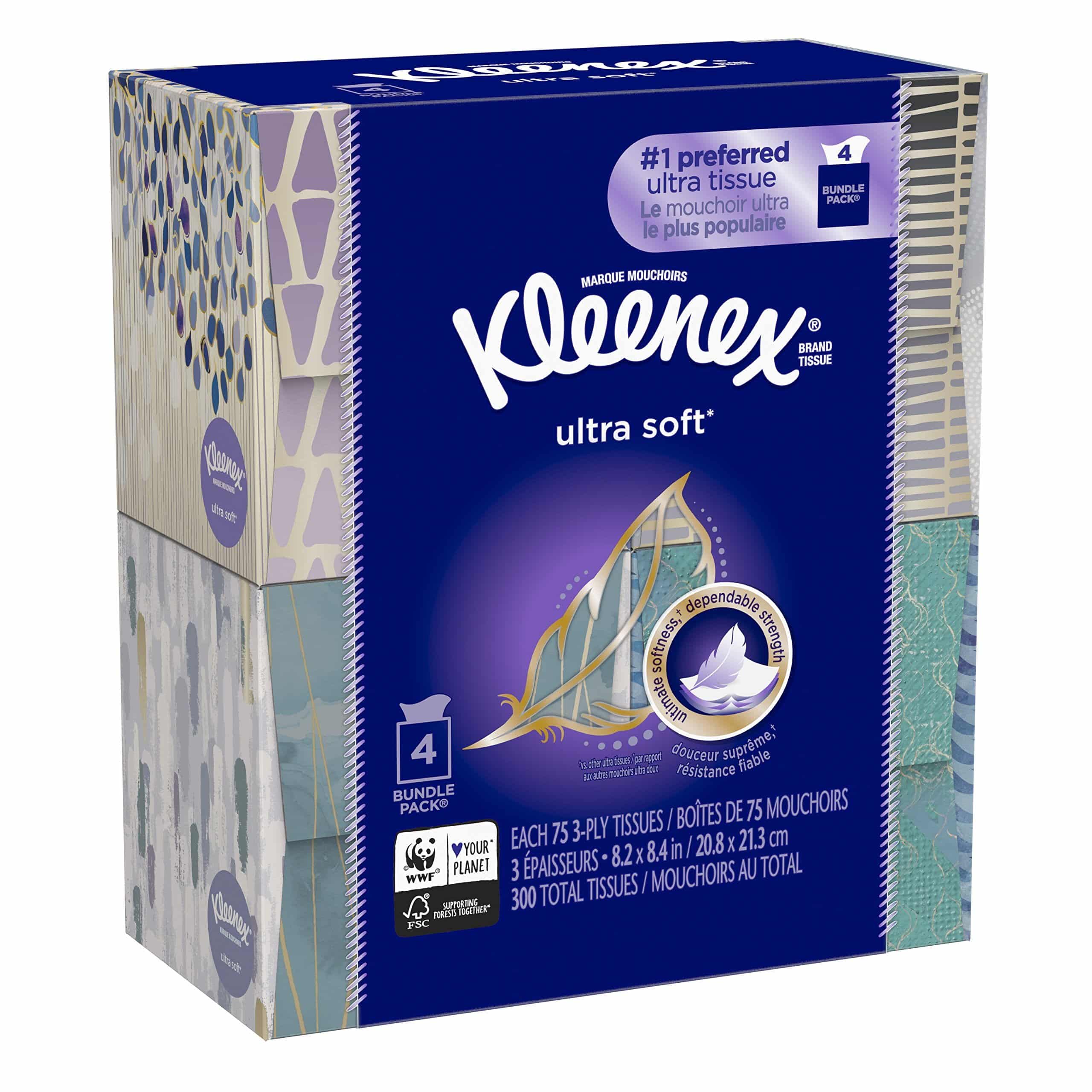 - Contains 4 cubes with 75 Kleenex Ultra Soft* tissues per pack