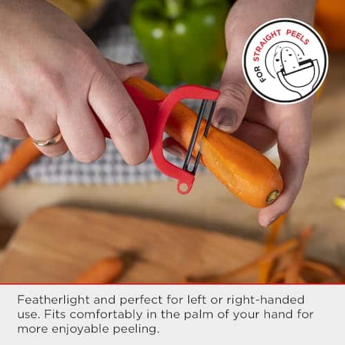 Original Swiss Peeler may have a feather-weight design, but puts in a heavyweight performance with its razor-sharp carbon steel blades ? it will tackle a wide variety of fruits, vegetables and potatoes with minimum fuss. It also has a convenient integrated potato eye remover and is ergonomically designed to fit in the left or right hand. Always have a peeler to hand with this set of three straight bladed peelers in red, green and dark grey. Super-sharp Swiss Peeler with integrated potato eye remover Carbon steel blades provide an ultra sharp, long lasting edge but must be dried thoroughly after washing Suitable for left or right-handed use Made in Switzerland