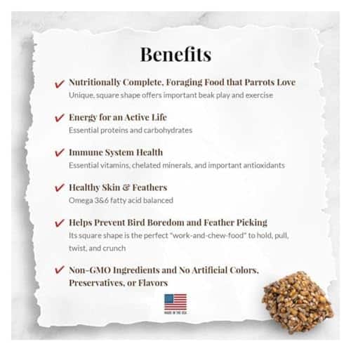 - NUTRITIONALLY COMPLETE FORAGING PARROT FOOD: formulated by top avian veterinarians and avian nutritionists; offers more foraging than pellets and the same complete nutrition