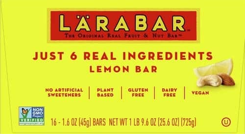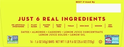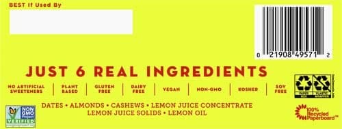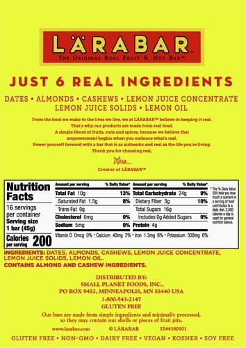 - MADE FROM 6 SIMPLE INGREDIENTS: Larabar Lemon Bar is made from just 6 simple ingredients: dates, almonds, cashews, lemon juice concentrate, dried lemon juice concentrate, lemon oil