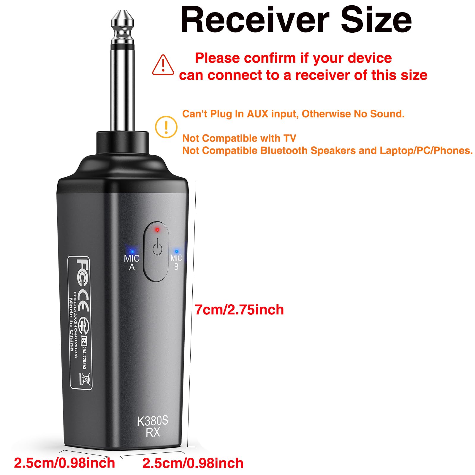 • ?? Plug and Play,Easy to Use: No need to pair, no need to buy batteries! The receiving box adopts 6.35mm audio head, which can be directly plugged into any audio, especially perfect for Karaoke, Speech, Meeting, and Performance. ?Can’t Plug In AUX input, Otherwise No Sound. Not Compatible with Bluetooth Speakers and Laptop/PC/Phones.