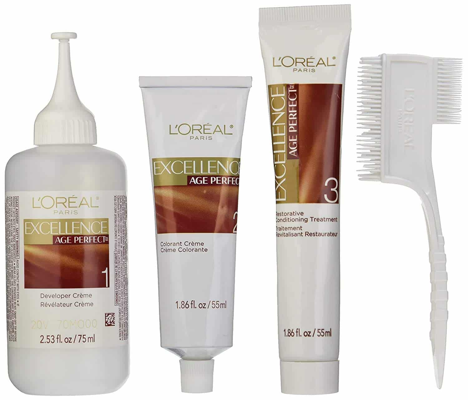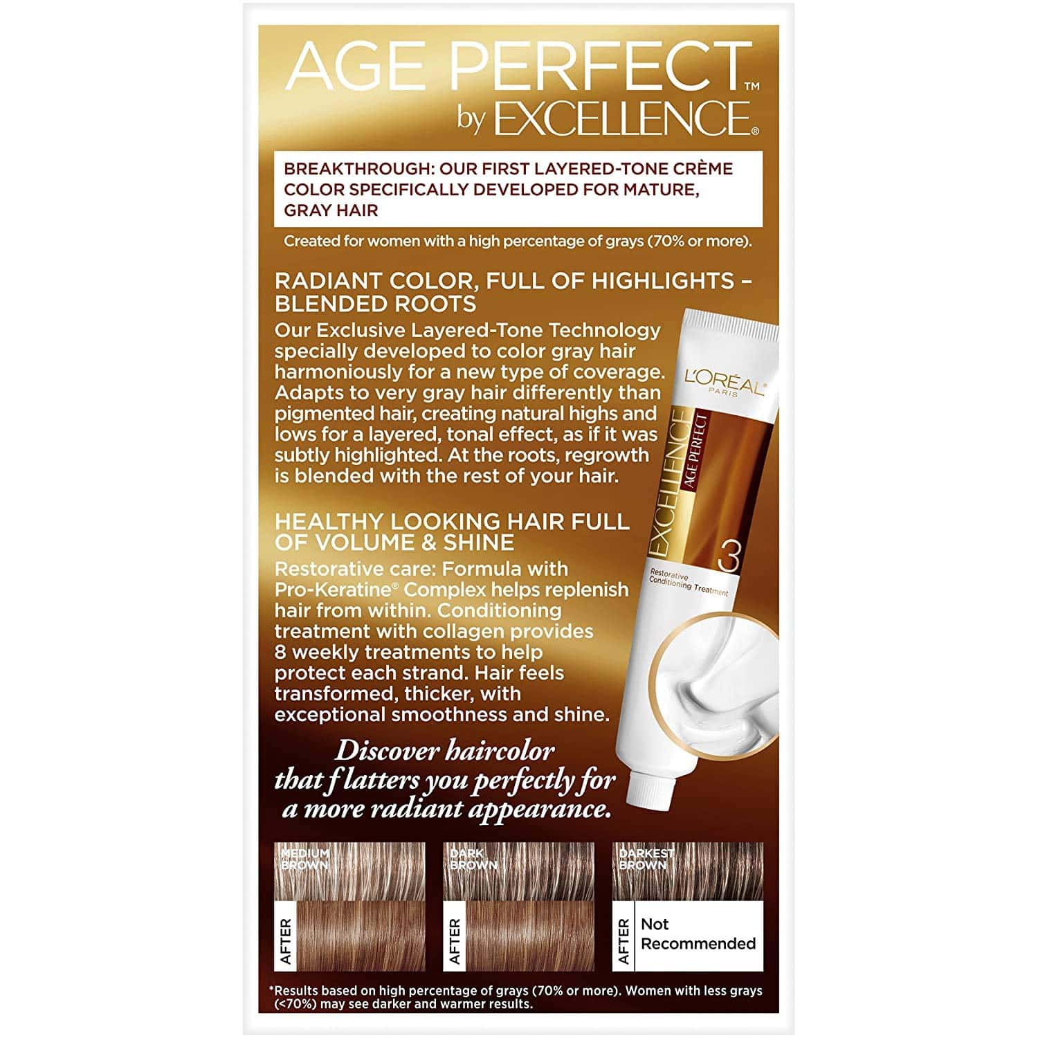 Excellence Age Perfect is our first hair color for mature hair, formulated with Pro-Keratin complex . Our layered tone technology delivers color full of natural-looking highs and lows. Grays are 100% covered, regrowth is beautifully blended and hair is renewed with volume and shine. Includes an easy application brush. Available in12 shades, including 4 new full of highlights brunette shades.