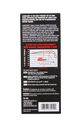 LUBEGARD HIGHLY FRICTION MODIFIED AUTOMATIC TRANSMISSION FLUID (HFM-ATF) SUPPLEMENT enhances DEXRON II, III / MERCON ATF with additional friction modifiers. The enhanced DEXRON II, III / MERCON ATF is a replacement for Original Equipment Manufacturers fluids such as; Honda Genuine, Toyota Type T, T II, T IV, Mopar ATF +3 (7176), ATF +4 (9602) and all other highly friction modified ATF?s. The LUBEGARD HFM-ATF formulation is based on the same patented technology found in LUBEGARD ATF Protectant which has gained worldwide acceptance in the professional aftermarket transmission repair industry and is also used, endorsed, designated and recommended by multiple Original Equipment Manufacturers (OEM)?s. Note: Use LUBEGARD HFM-ATF Supplement (Black Box) ONLY for applications that require highly friction modified fluids. Also do not use in CVT applications. Use in transmissions that do not have this requirement may cause excess wear and clutch slippage. Use LUBEGARD Automatic Transmission Fluid Protectant (Red Box – 60902) in all other ATF applications. DIRECTIONS FOR USE: For normal applications, add 1 oz. (29.6 mL) per quart (Liter) of DEXRON III, VI/ MERCON, V ATF to the total transmission capacity (including torque converter) with motor idling in park. Do not overfill. Do no use with Ford Type F ATF or in CVT?s.