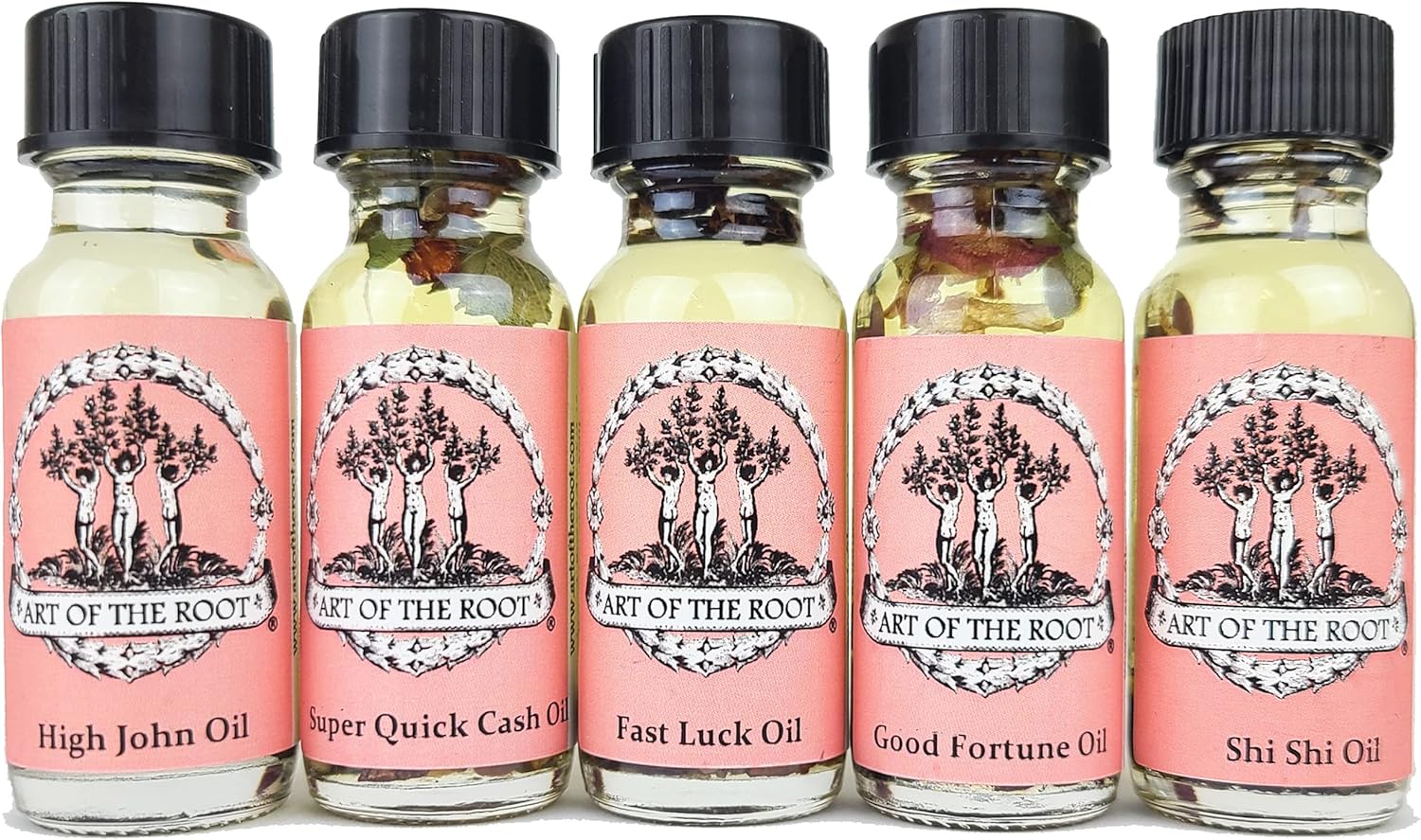 Our Luck & Good Fortune 5 Oil Set includes 5 of our most loved luck related oils. First, we have High John the Conqueror Oil which has real High John the Conqueror Root and can be used in rituals aimed at gaining success, power & luck. Fast luck Oil has a fresh minty scent and should be used in rituals which seek to achieve quick results in matters of finance, gaming, and chance. Use Shi Shi oil when performing rituals related to manifesting luck in all areas of your life, especially when focusing on games of chance. Everyone will love the rose, patchouli, sandalwood, & vanilla scent of our Good Fortune Oil. Use this in any ritual seeking better fortune and luck. Last, but not least, use our Quick Cash Oil when perfoming rituals which focus on obtaining quick, positive results in financial matters. All oils come in a ยฝ oz. glass bottle and include real herbs and essential oils.