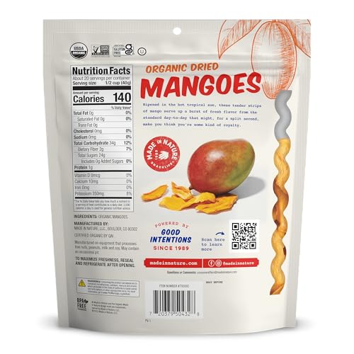 - ORGANIC DRIED MANGOES: Includes (1) 28 oz Resealable Bag of Made in Nature Organic Dried Mangoes – That’s it. The entire ingredient list. Seriously.