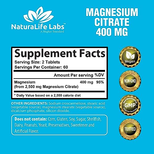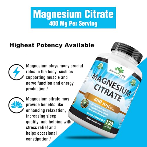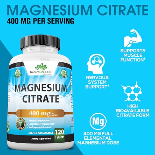 Magnesium Citrate 400 mg – High Potency Elemental Magnesium Essential Mineral for Heart, Muscle, & Digestion Support ? Non-GMO – 120 Tablets