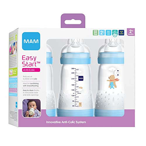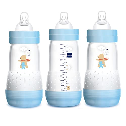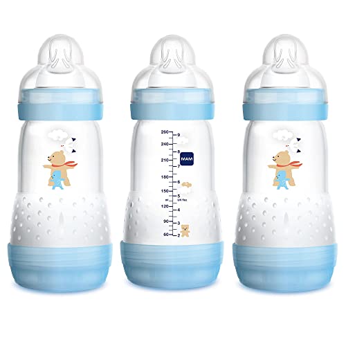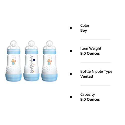 - PRODUCT DETAILS – MAM Easy Start Anti Colic Baby Bottles, 9 oz (3-Pack), 3 Baby Bottles with 3 Medium Flow Silicone Nipple, Newborn Essentials, Blue