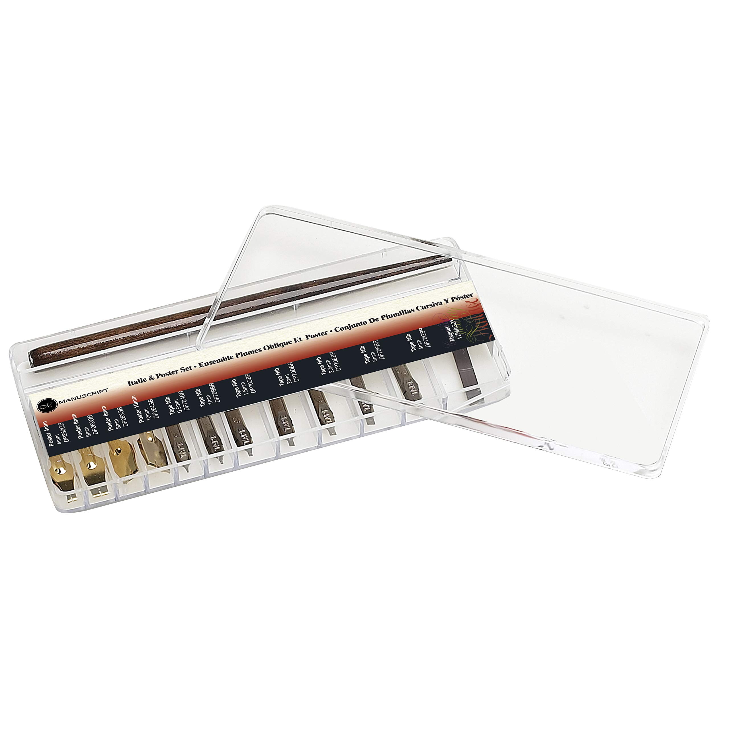 Manuscript Pen set Italic & poster- contains: Pen point holder; poster nibs in 4mm, 6mm, 8mm, 10mm; tape nibs in .5mm, 1mm, 1.5mm, 2mm, 2.5mm, 3mm, 4mm; and a magnet. Comes in a clear plastic storage case. Develop your skills and express your ideas through beautiful designs.
