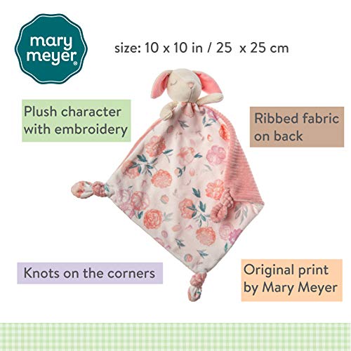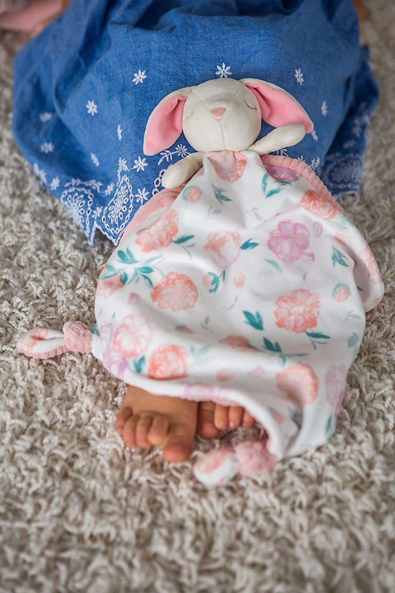 LOVEY TOY & SECURITY BLANKET IN ONE: Little Knottie is a huggable bunny attached to 10 x 10-inch blanket. BUNNY BUDDY: Soft toy is a sleepy-eyed, creamy white rabbit with pink-lined ears and a soft fabric nose, bunny’s arms are ready for a hug. GREAT FOR CUDDLING: Blanket front is floral watercolor print, back is wide ribbed fabric in rosy pink; knotted fabric on 3 corners, babies love the tactile fun