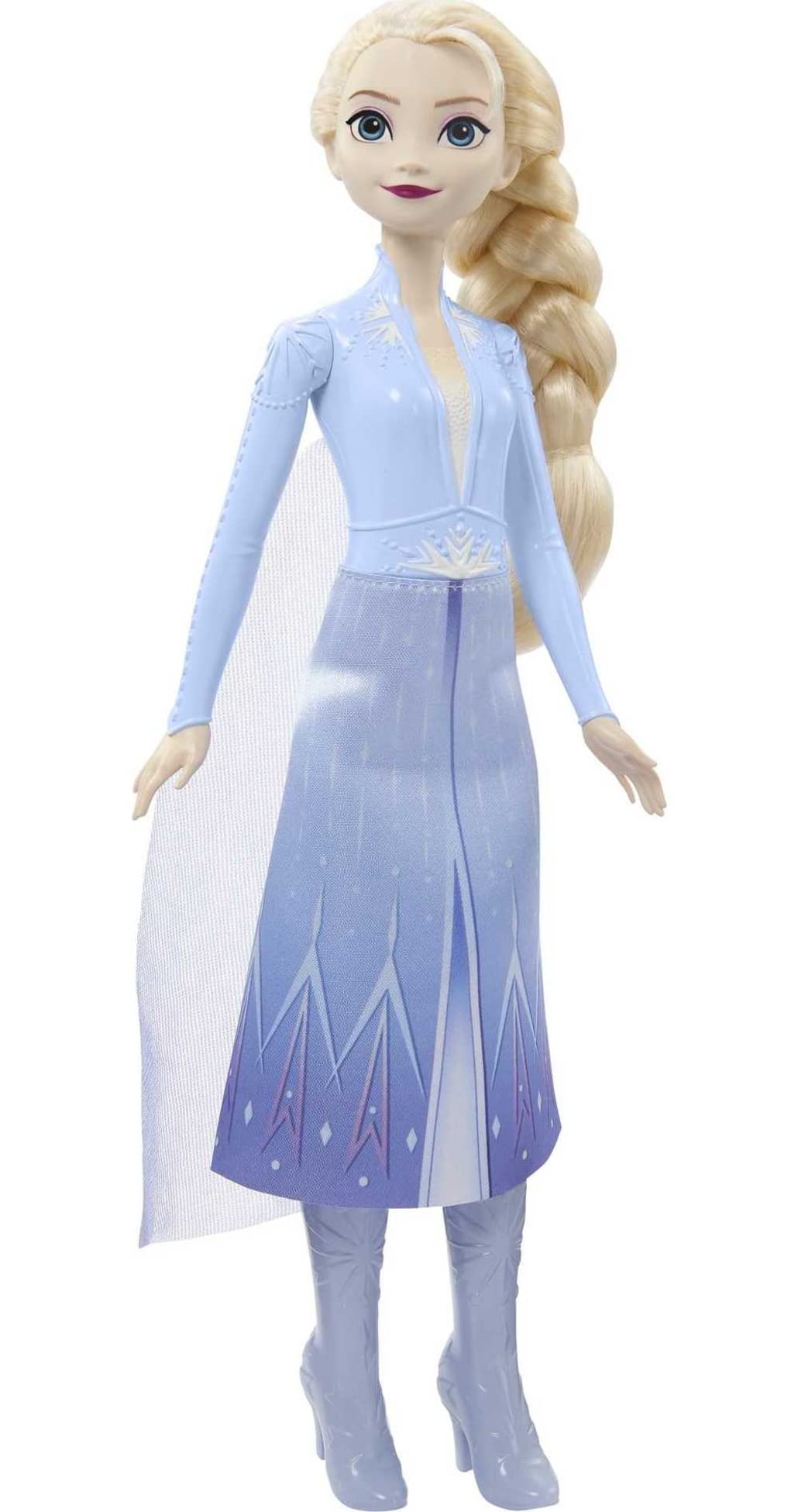 Meet this Elsa doll, inspired by the confident and powerful queen from Disney’s Frozen 2! This posable fashion doll is brought to life in her signature travel look, with accessories that include boots and a soft cape and skirt. In her signature outfit from the second movie, this Elsa doll is ready to fulfill her destiny! Doll cannot stand alone. Colors and decorations may vary.