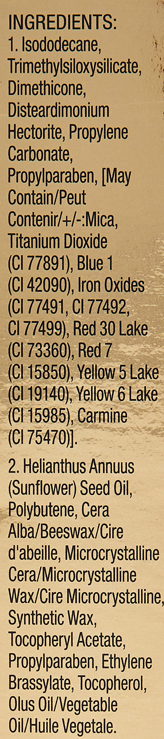 Paint for Lips – Isododecane, Thrimethylsiloxysilicate, Dimethicone, Mica, Quaternium-18 Hectorite, Propylene Carbonate, Propylparaben. May Contain: Mica Titanium Dioxide, Iron Oxides, Red 30 Lake, Red 7 Lake, Yellow 5 Lake, Blue 1 Lake, Carmine, Yellow 6 Lake, Red 6.