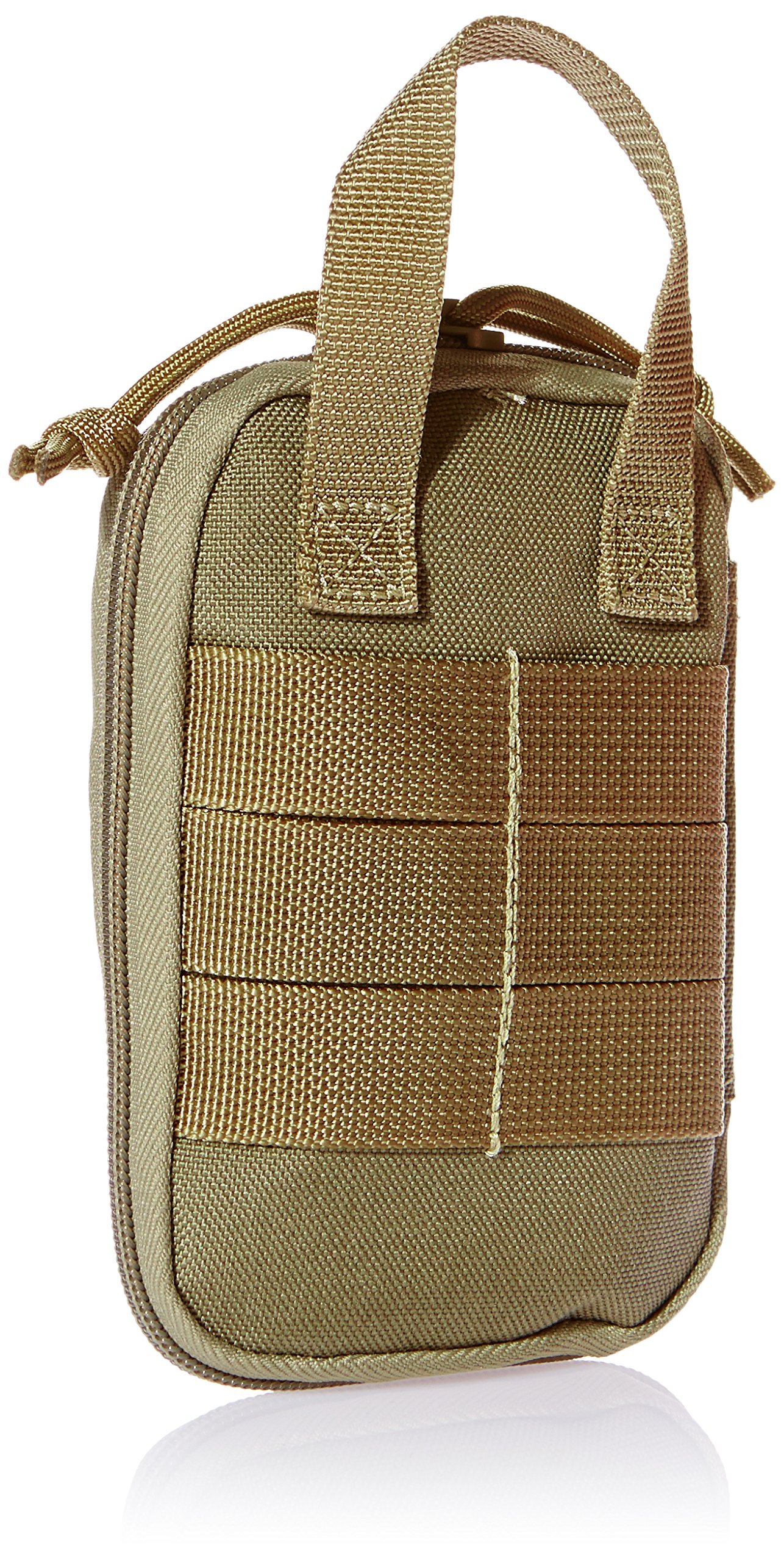 Khaki. Very compact 4″ x 6″ x 0.75″ size. Drops into pants cargo pocket or backpack/bag. Full clamshell opening main compartment with dual zips. Inside left: slip pocket; key ring; elastic organizer with 6 divisions. Inside right: slip pocket; tie-down loop; elastic organizer with 4 divisions. Front exterior: 1.5″ x 3″ loop field for patches; mesh slip pocket with hook-and-loop closure. Back exterior: carry handle; attachment webbing. Molle compatible. Attach using two 3″ TacTie attachment straps (optional accessory). 1050-Denier nylon construction with reinforced stitching throughout.