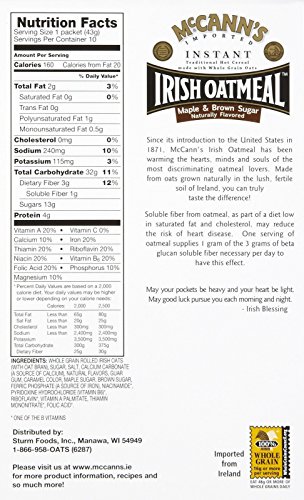 McCann’s Maple & Brown Sugar Oatmeal powers you through the day with a healthy oatmeal breakfast or snack that is ready in minutes. This instant hot oatmeal is made with whole grain oats that are cut a little finer to reduce cooking time, combining all the goodness of Irish oatmeal with natural maple and brown sugar flavors. With 10 convenient and portable instant oatmeal packets per box, this flavored oatmeal allows you to effortlessly prepare a hot cereal meal at home, at work or anywhere you go. McCann’s quick oatmeal is a good source of soluble fiber, and is certified kosher for those who have dietary preferences but still want to enjoy a great taste. To enjoy a nutritious hot oatmeal bowl, empty a packet into hot milk or boiling water. Or microwave the contents of one packet on high with up to 2/3 cup of milk or water for one to two minutes. Stir before serving and use less water for a thicker mixture.