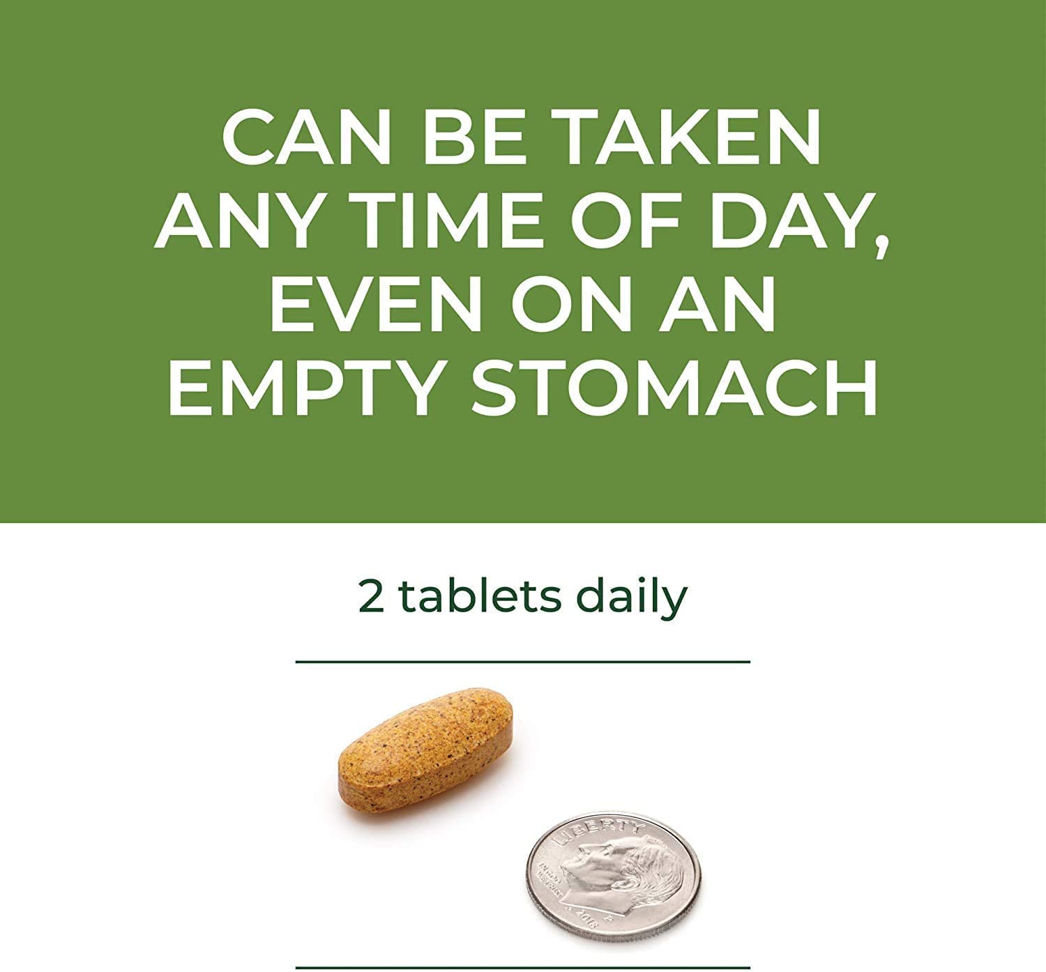 - Can be taken any time of day, even on an empty stomach. 2 tablets daily