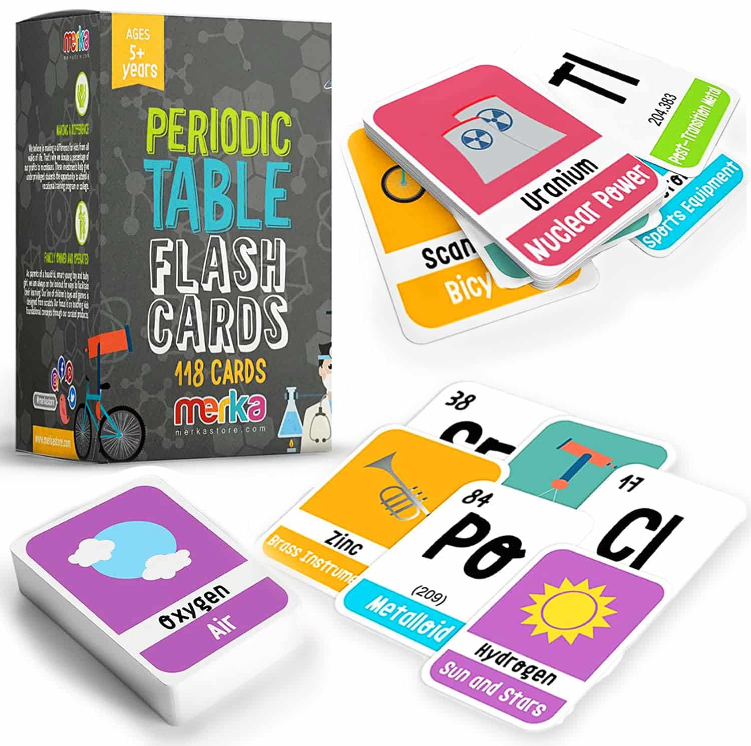 Designed by teachers, merka Periodic Table flashcards are an effective reference tool for use at home or in the school classroom. This deck of 118 colorful, laminated cards teaches the essential facts pertaining to all the elements in the Table: name, symbol, mass, and atomic number. Each card also indicates the chemical family (gases, metals, etc.) and includes a fun illustration representing the element. Made of heavy cardstock, our Periodic Table flashcards are similar in size and shape to ordinary playing cards. They re an excellent size for travel use or on-the-go learning. All merka educational cards are made of quality materials waterproof, BPA-free and 100% safe for kids and adults. Recommended for ages 5 and up.