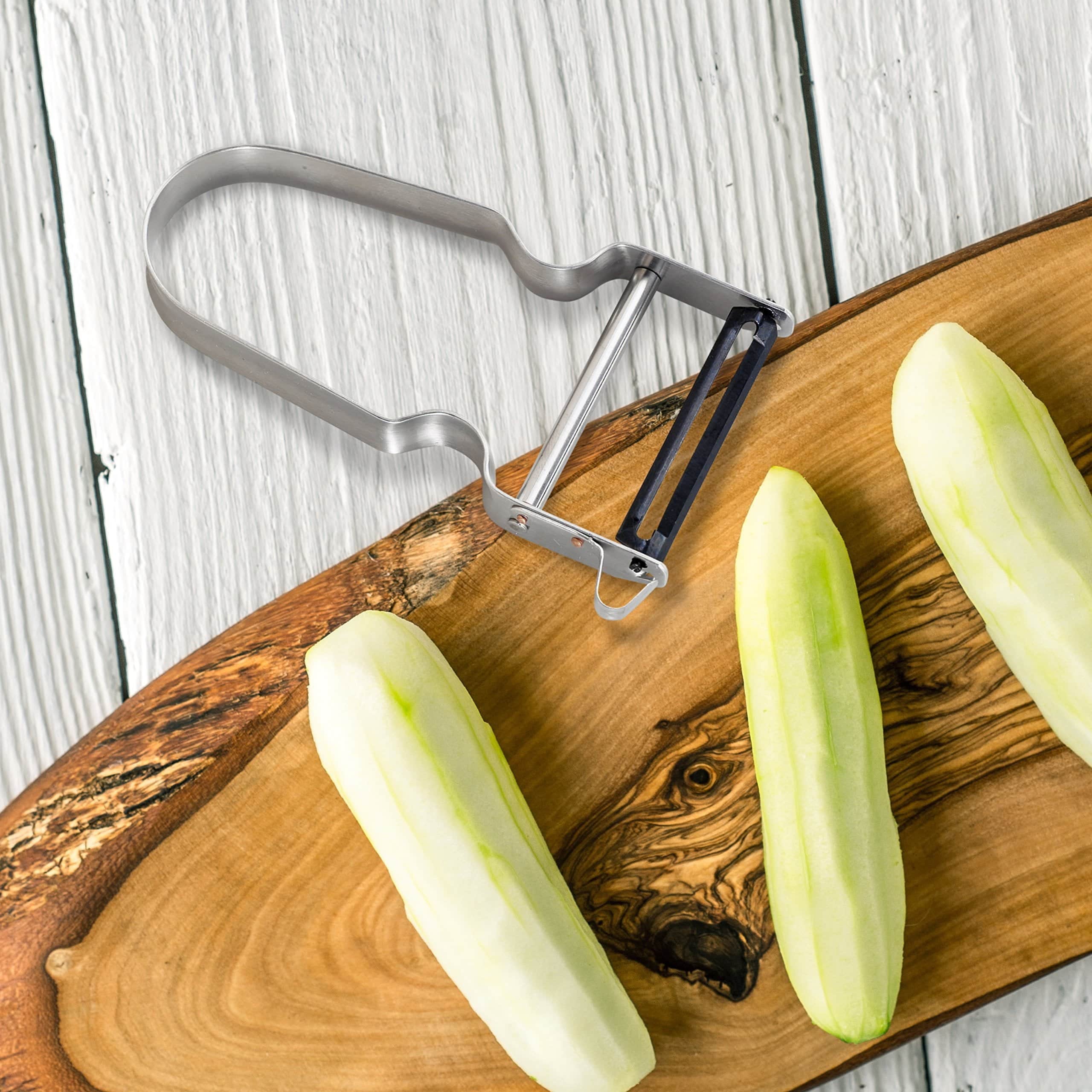 Chef Harvey?s Swiss Peeler for peeling fruits and vegetables and creating thinly sliced uniform strips that cook evenly. Its extra-sharp blade will never dull or need sharpening. The contoured handle is comfortable to use, keeps hands from slipping toward the blade, helps prevent hand fatigue during longer periods of use. This kitchen gadget performs the tasks of multiple kitchen tools, saving time and making food preparation tasks easier. It?s a great carrot peeler, apple peeler, potato peeler, and all-purpose vegetable peeler. Make healthy snacks, thinly sliced fruits and vegetables or cheeses for salad toppings, stir fry or garnishes, even make veggie pasta strands, shaved chocolate curls for cake decorating, and more. The built-in potato eye remover easily removes imperfections and eyes from potatoes and other produce without excess waste. Made from stainless steel with carbon steel blade, Chef Harvey?s Swiss Peeler will never dull or need sharpening. Hand wash only. Make sure to dry blade thoroughly.
