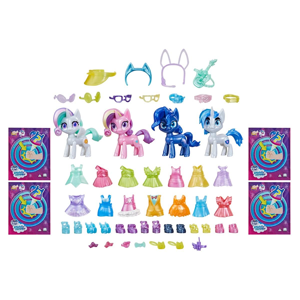 These ponies are poppin! Smashin’ Fashion Royal Premiere set features 4 royal pony figures that are fully poseable for wild and crazy adventures. Ponies comes with over 40 fashion accessories, including 4 hidden outfit accessories! Place the 4 included Smashin’ Packs on a flat surface (front side up) and smash them to see them expand, then POP! Each bag will pop to reveal a character-inspired fashion accessory and friendship balloon. Imagine Princess Celestia, Princess Luna, Princess Cadance, and Shining Armor are getting ready for an exciting royal movie premiere! Figures come with fashion accessories including dresses, shoes, sunglasses, headbands, belts, and a tuxedo. 4 of the outfits are hidden inside the Smashin’ Pack for an exciting unboxing reveal!