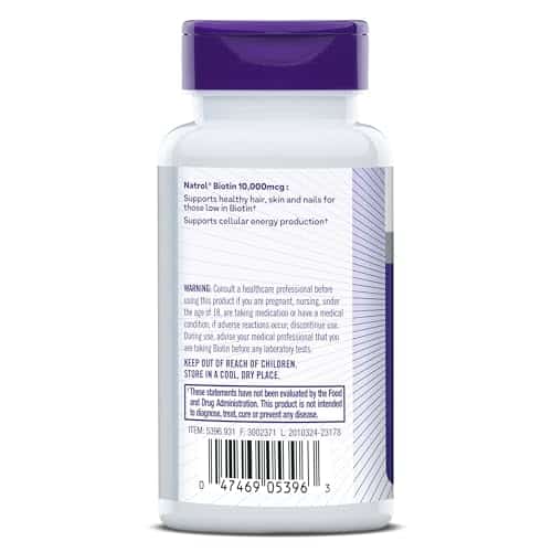 Natrol Beauty Biotin 10000mcg tablets support healthy hair, skin and nails for those low in Biotin.(1) These dietary supplements support healthy carbohydrate, fat and protein metabolism.(1) Made from high-quality ingredients and 100% drug-free. These vegetarian and non-GMO dietary supplements exclude common food allergens. Biotin is a form of Vitamin B, also known as Vitamin H or B7, that helps support the metabolism and assists in the conversion of food into energy.(1) Adults, take one tablet daily with a meal. Natrol is dedicated to creating innovative, quality products, to help you maintain good health and thrive in your busy, modern lifestyle. (1)These statements have not been evaluated by the Food and Drug Administration This product is not intended to diagnose, treat, cure or prevent any disease.